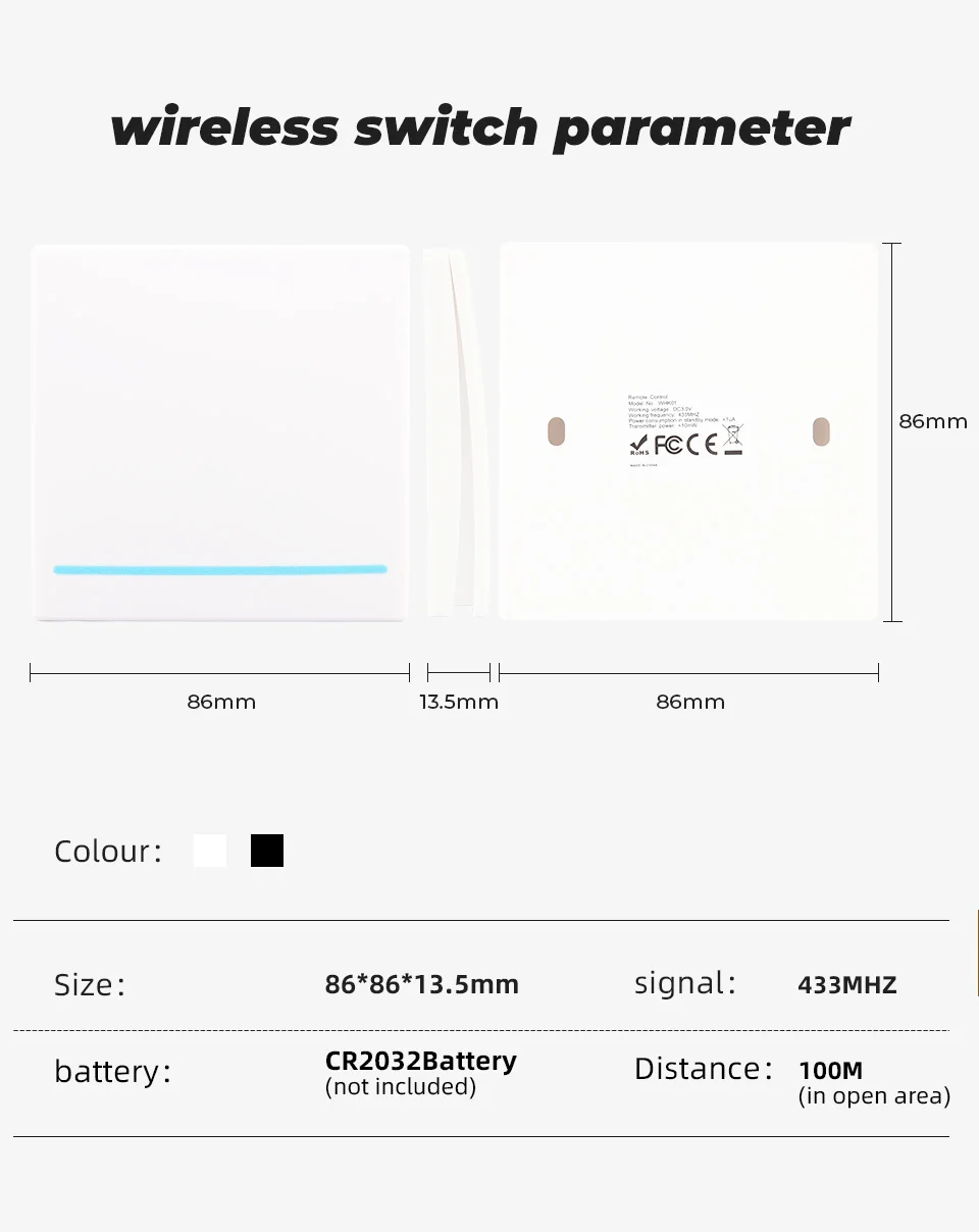 1. Рабочее напряжение: 3 В постоянного тока 2. Рабочая частота: 433,92 МГц 3. Мощность передачи: <10 мВт 4. Расстояние дистанционного управления: 100 метров (внутреннее расстояние) 5. Метод работы: беспроводной пульт дистанционного управления 6. Метод программирования: Обучающий код 7. Метод модуляции: ASK 8. Рабочая температура: -10 град. C ~ + 70 град. C 9. Размер: 86*86*13,5 (мм) 10. Стандартная батарея, батарея Cr2032 (батарея в комплект не входит)