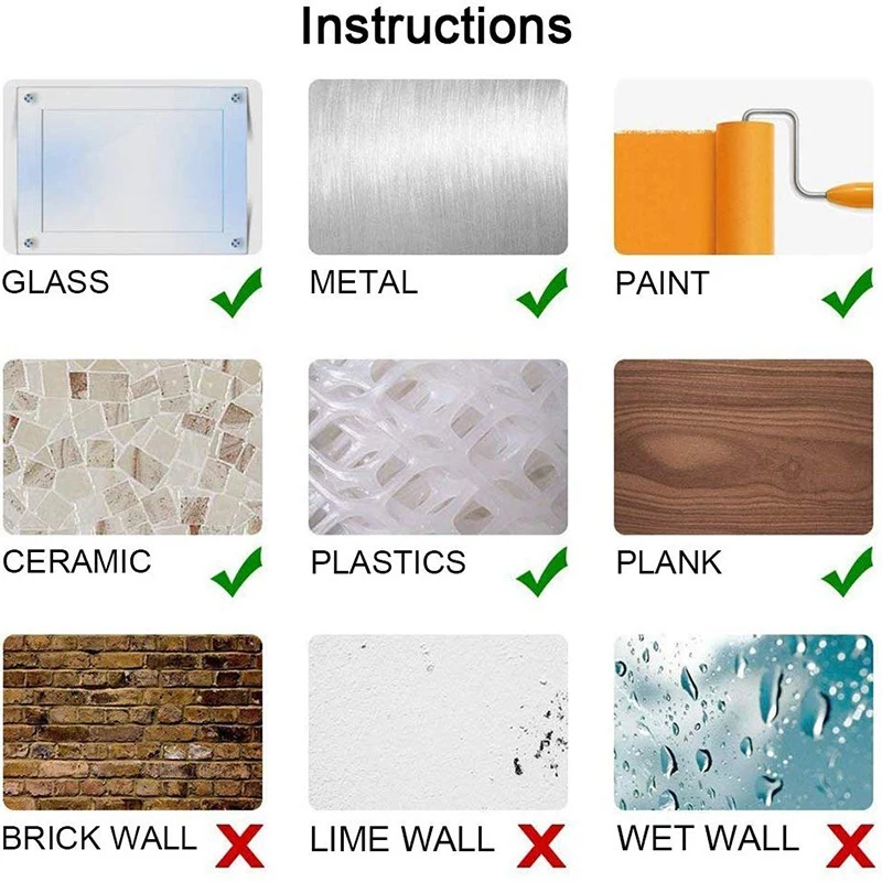 1. Перед установкой сделайте контактную поверхность чистой и сухой, строго Следуйте указаниям, не подходят для шероховатых или жирных поверхностей или поверхностей, как окрашенные стены и хрупкая настенная бумага и т. Д.