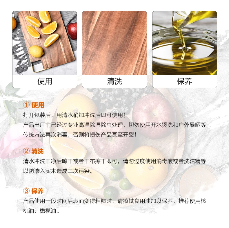 ① Использование После открытия посылка, добавьте в краску воду, а затем используйте! Перед отправкой с завода, продукт был обработан с профессиональной высокой температурой осушения и удаления насекомых. Не используйте традиционные методы, такие как горячее мытье кипятком и воздействие Солнца на открытом воздухе, в противном случае продукт будет поврежден или даже треснут. ② Чистка Не используйте дезинфицирующее средство или моющее средство для предотвращения вторичного загрязнения, вызванного проникновением твердой древесины. ③ Техническое обслуживание Когда поверхность продукта становится грубой после использования в течение определенного периода времени, пожалуйста, протрите пищевое масло для обслуживания. Рекомендуется использовать масло грецкого ореха и оливковое масло.