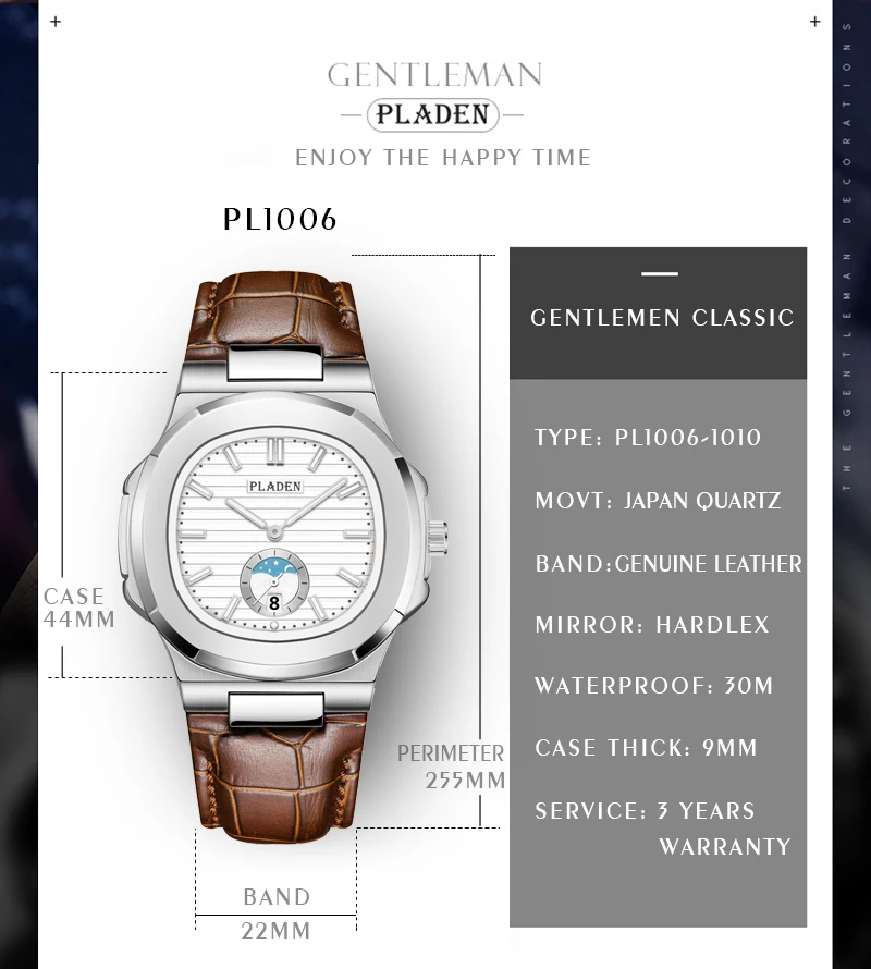 Мужские часы PLADEN, брендовые модные часы розового золота для мужчин, роскошные высококачественные наручные часы с ремешком из нержавеющей стали, Лидер продаж 2020 Описание: -100% новый и высокое качество. -Кварцевые водонепроницаемые светящиеся часы с автоматической датой. -Модель ремешка из нержавеющей стали: чехол из нержавеющей стали 316L и ремешок из нержавеющей стали. -Модель кожаного ремешка: кожаный ремешок для часов и чехол из нержавеющей стали 316L -Водонепроницаемость на глубине 30 м. -Рождественский подарок, праздничный, вечерние, для дня рождения, для свиданий, для деловых встреч. Характеристики (прибл.): -Корпус Диаметр: 4,3 см прибл. -Толщина корпуса часов: прибл. 1 см -Диапазон Длина (в комплекте чехол): 19 см прибл (кожаный ремешок 25,5 см). -Ремешок Ширина: 1,9 см прибл. Посылка включает в себя: 1 x оригинальные часы PLADEN. 1 x Руководство по эксплуатации. Мы обещаем: Все наши продукты являются оригинальным брендом; Мы обещаем полный возврат или обмен, если посылка была подтверждена утерей; Мы предоставляем оптовые, индивидуальные, прямые поставки Доставка: Мы будем иметь дело с вашим заказом в течение 1 дня и иметь номер отслеживания; Доставка в большинство стран обычно занимает 10-35 дней. Российские покупатели должны предложить полное имя, в связи с политикой почты России. Отзывы: Если вы удовлетворены нашими продуктами и обслуживанием, пожалуйста, не забудьте дать нам 5 звезд положительные отзывы. Большое спасибо!