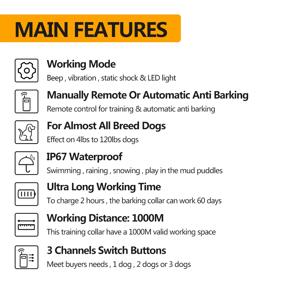 Характеристики продукта Название товара собачий тренировочный воротник с пультом дистанционного управления Модель № PD525 Применение собак (маленькие собаки среднего и большого размера) Породы собак подходят для всех видов собак Размер собаки подходит для всех размеров d собак Литий-ионная аккумуляторная батарея Срок службы батареи 450 циклов зарядки Время зарядки 2 часа Время работы воротник приемника 45 дней +, дистанционный передатчик: 90 дней + Режим работы звук вибрации шок Водонепроницаемость: воротник приемника уровень IP67, дистанционный передатчик: уровень IPX5 Преимущества: тренировка лай Стоп/ежедневное обучение/правильное обучение вредным привычкам/Прочая профессиональная подготовка