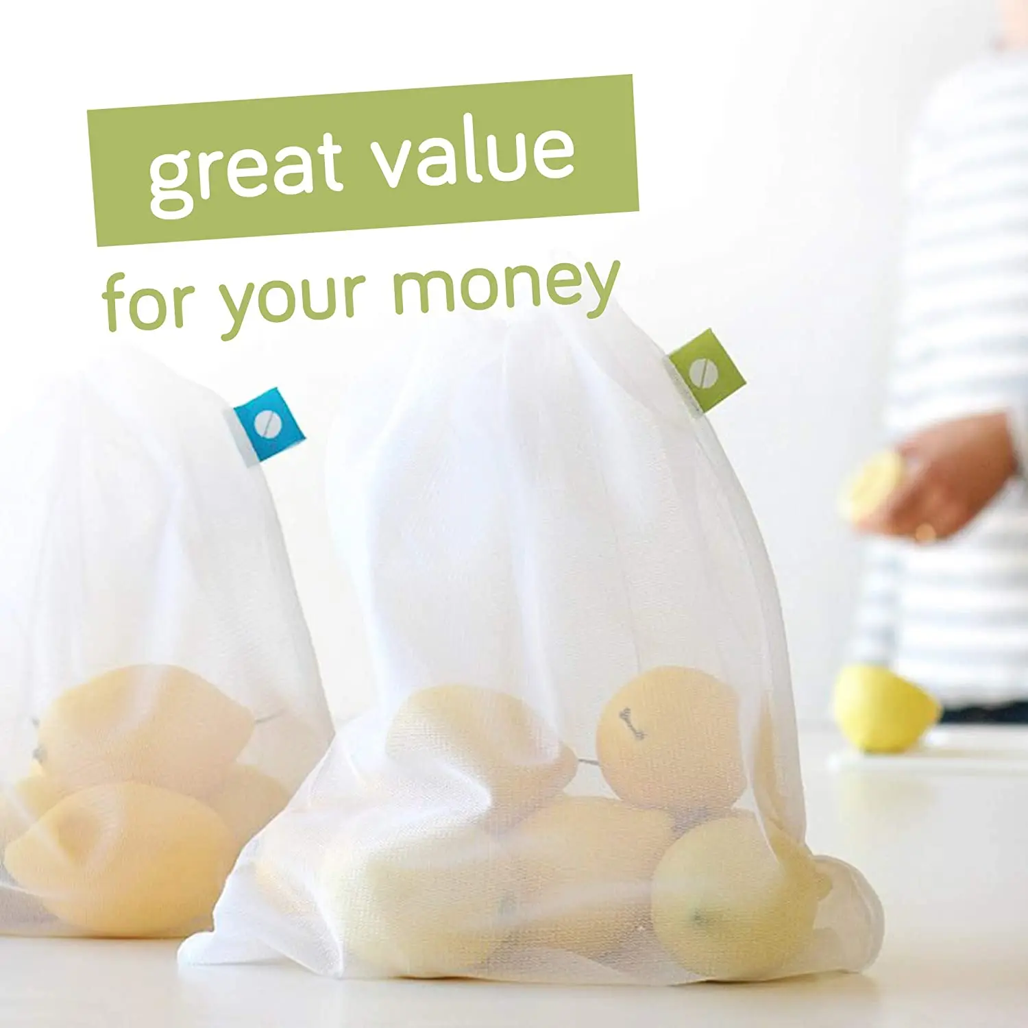 2. Каждая многоразовая сетка производит мешок размером 12x14 дюймов и является полупрозрачной, так что содержимое видно. Он очень легкий, но прочный и прочный, чтобы держать ваши фрукты и овощи. Каждая сумка весит всего лишь 0,4 унций. Сумки также имеют веселые цветные бирки, если вы хотите, чтобы цвет совпадал с конкретными фруктами, овощами или чем-то, что вам нравится.