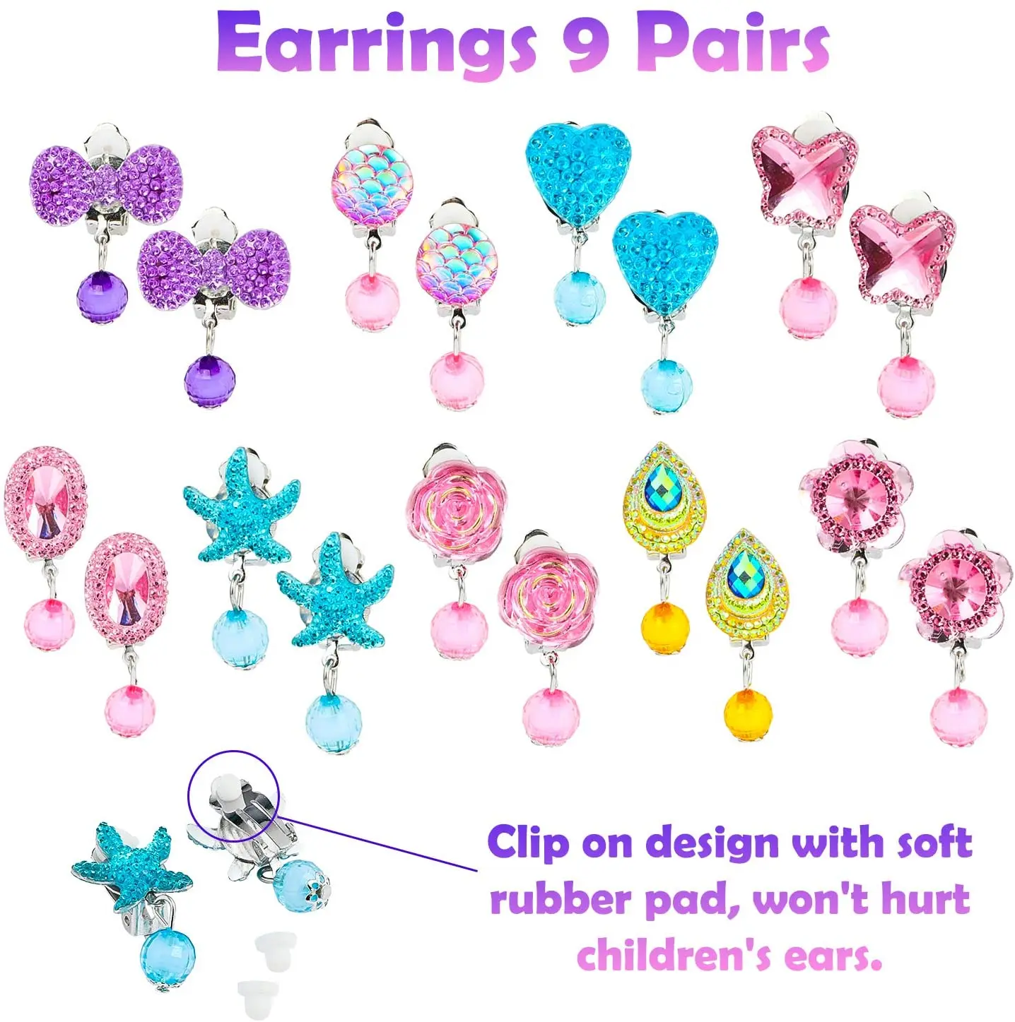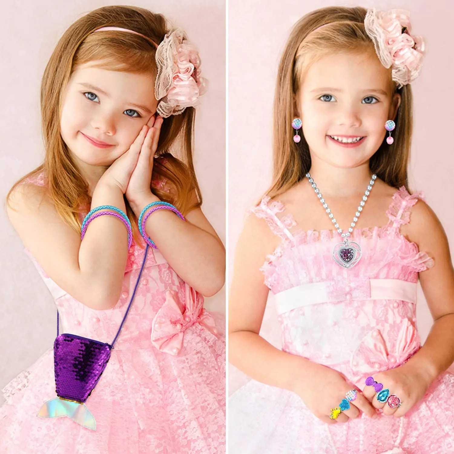 【Упаковка с тематическим значением Русалочки 】 Всего 62 шт. В комплект входят: 26 регулируемых колец, 9 пар сережек, 9 ожерелий, 8 браслетов и 1 Сумочка с блестками в виде Русалочки.