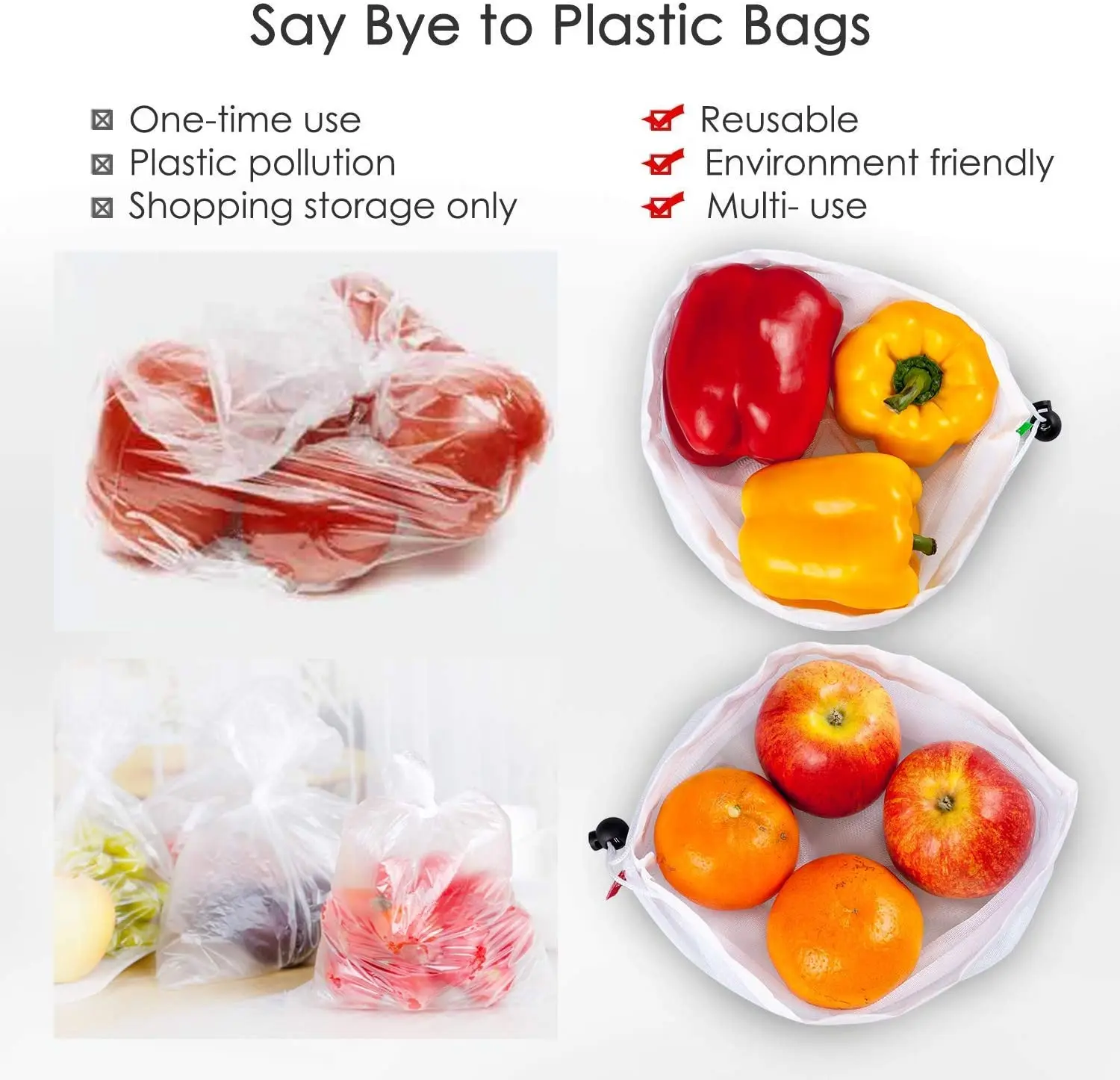 1. Давайте работать вместе, чтобы устранить сотни пластиковых пакетов. Каждый мешок для производства сетки имеет потенциал для устранения до 1000 пластиковых пакетов в течение всего срока службы. Так как наши сумки многоразовые, вы просто тратите немного больше спереди, будет экономить больше денег в долгосрочной перспективе.