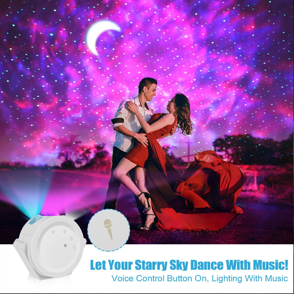 ♬【Звездное освещение может танцевать с помощью музыки 】мы открываем функцию голосового управления для вас. Звездный и развевающийся светильник потолочных звезд будет танцевать в соответствии с музыкой, которую вы играете. Идеально подходит для создания атмосферы для свадьбы, вечерние, детской комнаты, дня рождения, йоги и спа-салона в помещении. Добавьте больше удовольствия к вашему опыту использования! Примечание: Включите Голосовое управление, светильник выключен. Ночной светильник проектора будет мигать со звуком. Например, звук хлопает, стучится в стол (не слишком далеко), или ритмичная музыка!