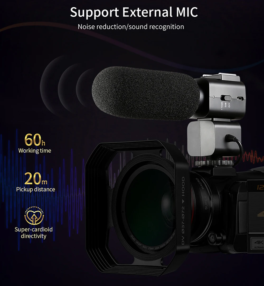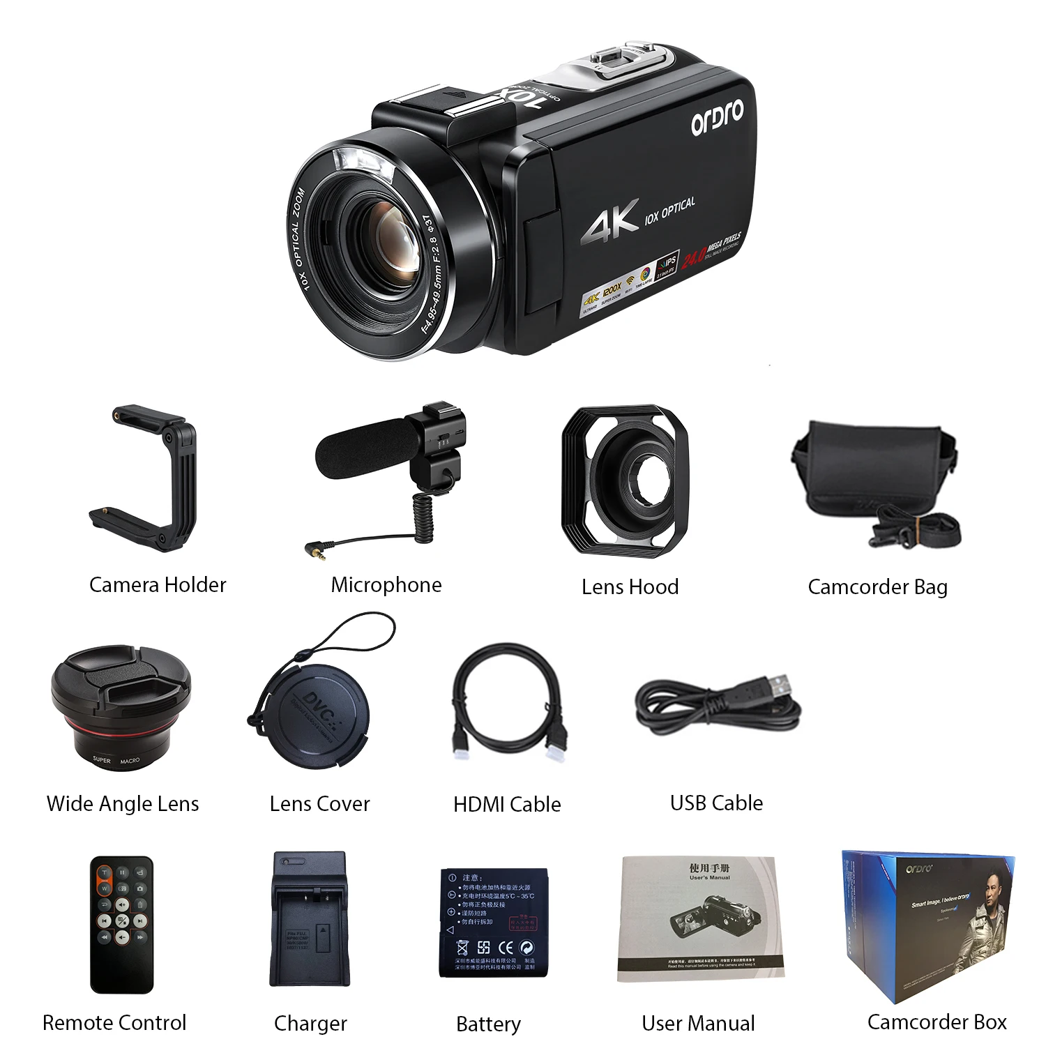 ORDRO HDR-AC7 10x оптический зум 4K @ 24FPS видеокамера с внешним микрофоном: с разрешением 4K UHD и 10x оптическим зумом, видеокамера ORDRO HDR-AC7 может выполнять чрезвычайно высокое качество изображения и захватывать прекрасный момент. Новое обновление 3,1 дюймов IPS сенсорной панели. Дизайн горячего башмака может быть прикреплен с внешним микрофоном ORDRO CM520, который может точно подобрать звук, устранить шум и шумоподавление NCR во время записи, что обеспечивает вам более чистое качество звука. Высокая чувствительность COMS Сенсор: с 5,0 мегапиксельный Высокочувствительный CMOS Сенсор, он может ощущать окружающую среду и деликатно сложных светильник. Благодаря быстрой скорости захвата изображения и возможности обработки изображения, он может повысить четкость изображения, чтобы выполнять более естественно яркое и реалистичное качество изображения. Советы: в посылка отсутствует карта памяти, прежде чем использовать эту камеру, купите SD карту класса 10 объемом 32-128 ГБ и отформатируйте ее. Прикрепите внешний 0.39X Широкий формат объектива: это видео камера оснащена профессиональным 2-в-1 0.39x (с макро объектив б/у) Широкий формат объектив для более широкого спектра съемки. Съемный макрообъектив для очень высокого разрешения крупным планом мелких объектов. Чтобы использовать макрообъектив, вам нужно отделить два объектива, отвинчивая. Пожалуйста, подтвердите расстояние фокусировки 1,5 м или более. Если вам нужны снимки крупным планом, используйте макрообъектив и удерживайте расстояние 4-5 см от объекта. Поддержка записи видео во время зарядки: видеокамера ORDRO AC7 поддерживает запись видео во время зарядки, вы можете использовать usb-кабель для подключения дополнительного внешнего аккумулятора для зарядки во время записи. В посылка приходит с одним NP-40B 3,7 V 1250mAh литиевые батареи и зарядные устройства. При первом использовании, пожалуйста, зарядите аккумулятор в течение 3 часов, чтобы убедиться, что он полностью заряжен, он может снимать видео до 1,5 часов. (Советы: время работы аккумулятора сократится в режиме Wi-Fi). Подключение Wi-Fi и пультом дистанционного управления Управление: видео и фото может быть Управление led и общими загрузки приложений (D-VIDEO) на смартфон (поддержка мобильного телефона Android или IOS системы, меньше, чем 9,8 футов). Поставляется с пультом дистанционного управления, который может использоваться для управления видеокамерой для съемки фотографий и видео на расстоянии менее 16 футов. Советы: при использовании пульта дистанционного управления, пожалуйста, снимите пластиковый лист в нижней части.