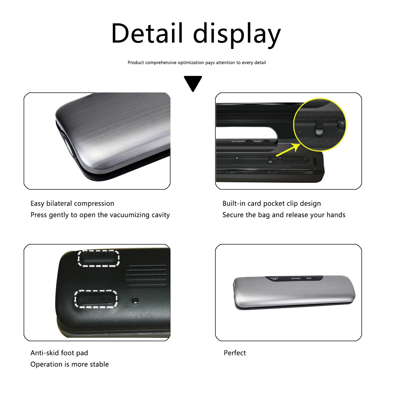 1. Конструкция одной кнопки, время уплотнения 5 секунд, вакуумное уплотнение 8 секунд, простота в использовании. 2. Полные функции, блокирует питание и остается свежим, подходит для различных продуктов питания. 3. Держите холодильник в чистоте, без особого запаха, увеличьте пространство для хранения. 4. Компактный и портативный дизайн, гладкая поверхность, легко моется. Широкое использование, подходит для дома и торговли. 5. Эффективно Избегайте пищевых отходов, Экономьте деньги и время. 6. Удобно для подготовки пикников, походов, барбекю и вечеринок на открытом воздухе заранее.
