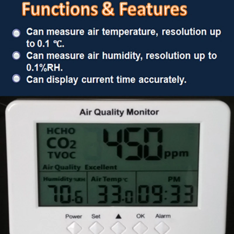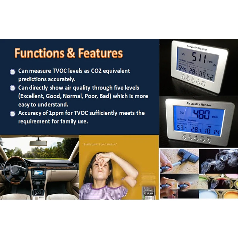 Может непосредственно показывать качество воздуха через пять уровней превосходного, хорошего, нормального, плохого, плохого), что более легко понять точность 1ppm для TVOC достаточно отвечает требованиям для семейного использования.