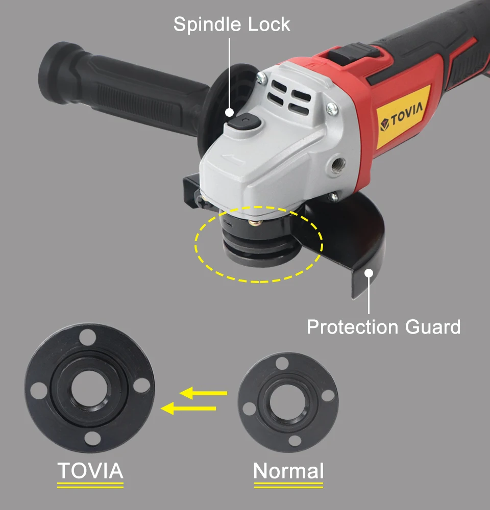 Более крупная и толстая пластина обеспечивает более безопасную и надежную установку пильного полотна или шлифовального круга. Быстрая замена пильного диска из-за Резьбы Шпинделя M14 с блокировкой шпинделя. Предохранитель безопасности позволяет избежать любых искр и осколков.