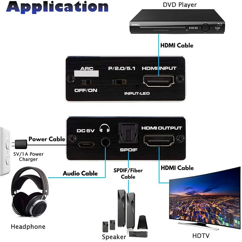 HDMI к HDMI и o экстрактор подходит для различных подключенных к HDMI устройств, таких как Blu-ray/HD плеер/спутниковая коробка/Apple TV/Amazon Fire TV/Roku/Chromecast/ноутбук/PS3/PS4/DVD/HD камера/HD DVR и т. Д. Идеальный выбор для потокового медиаплеера, игровых консолей и проекторов, у которых нет оптического SPDIF или 5 мм стереопорта.