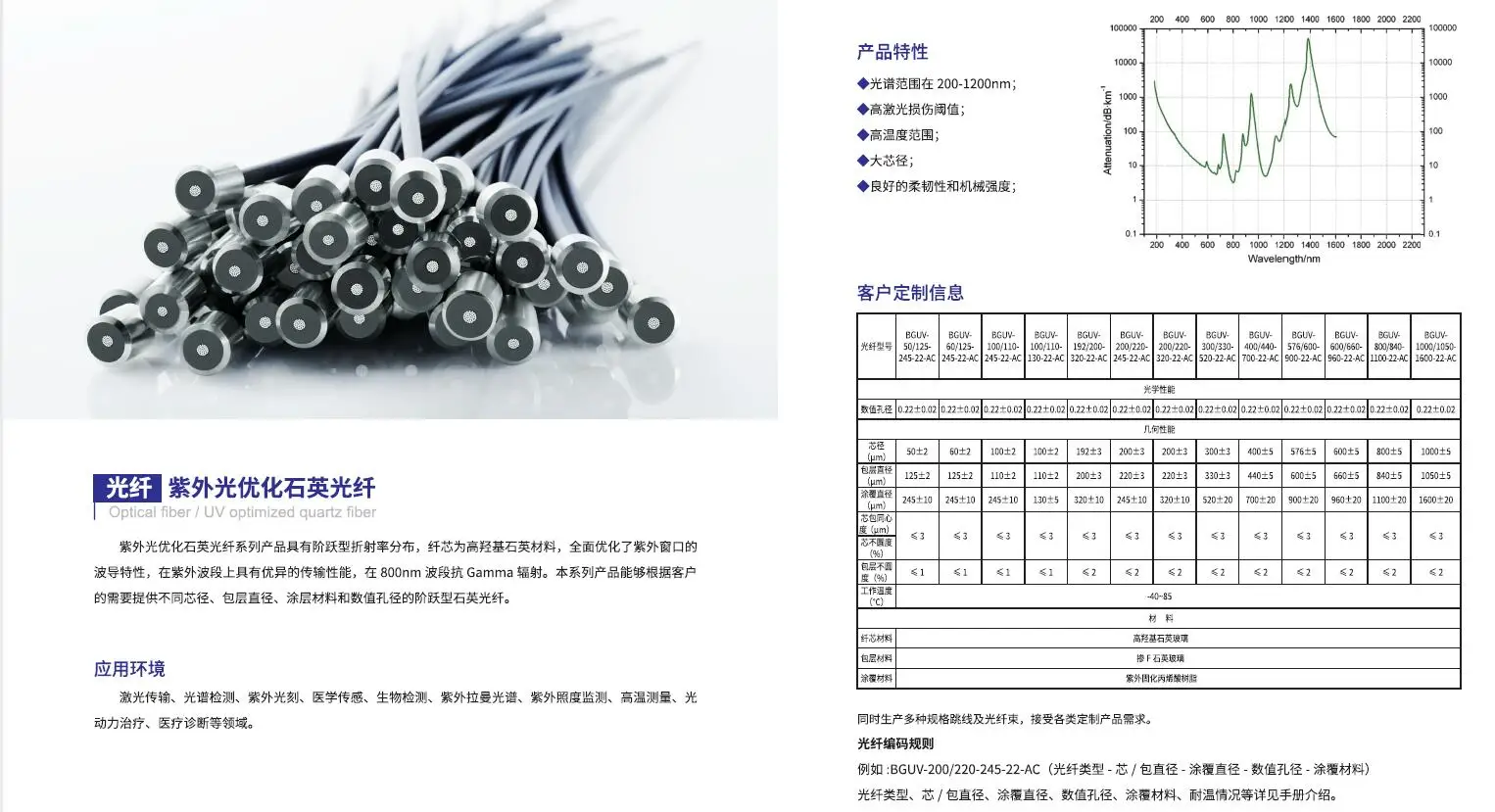 Информация о заказе: 1. Тип разъема: FC/ST/SC/SMA905 2. Тип наконечника: металл или керамика 3. Тип волокна: силикон/пластик/керамика/кварц/стекло 4. Длина: 1/2/3/5/10 м ........ 5. Диаметр сердечника: 100/200/300/400/600/800 мкм 6.NA: 0,12 или 0,22 или 0,37 7. Другие детали: бронированная куртка Особенности Хорошая устойчивость к усталости Большое оптическое волокно, разнообразие Дополнительных спецификаций Варианты диверсификации соединителя, Специальный заказ Волокно 105-1500 мкм на выбор Диапазон длин волн 190-2500 Нм Можно выбрать Применение Эксперименты с оптическими приложениями При измерении Медицинское устройство обнаружения света Промышленный кремний, жидкий, спектральный Обнаружение Тестирование безопасности пищевых продуктов УФ для ухода за кожей Промышленный контроль, завод Автоматизация Автомобили и самолеты Как военное применение