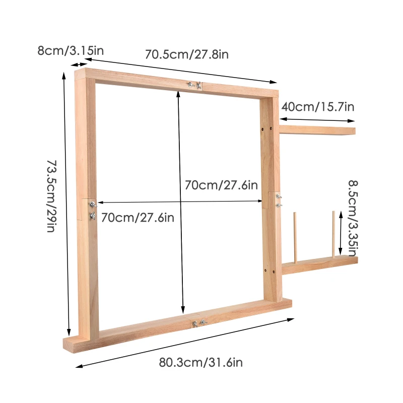 Material материал из твердой древесины, прочный, гладкий и деликатный, оснащен двумя деревообрабатывающими щипцами, которые могут быть закреплены на рабочем столе. Мы сделали толщина деревянные планки 2,5 см/1 дюйм из-и шириной до 7 см/2,75 дюйм (ов). Вес всего комплекта составляет 6,8 кг/15,1 фунтов. В внутренний диаметр в деревянную раму составляет 70 см/27,5 ", таким образом, вам нужен ворсовая ткань, по крайней мере, 90*90 см/35*35".