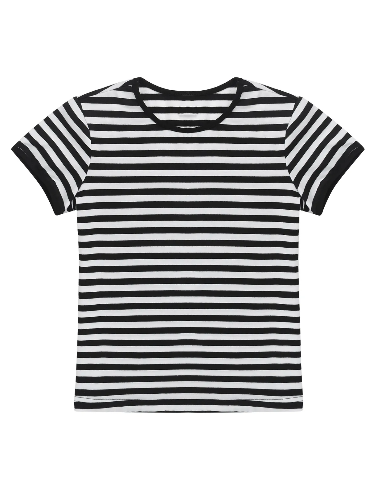 Short sleeves t-shirt, round neck, black & white striped design. Pull on closure.