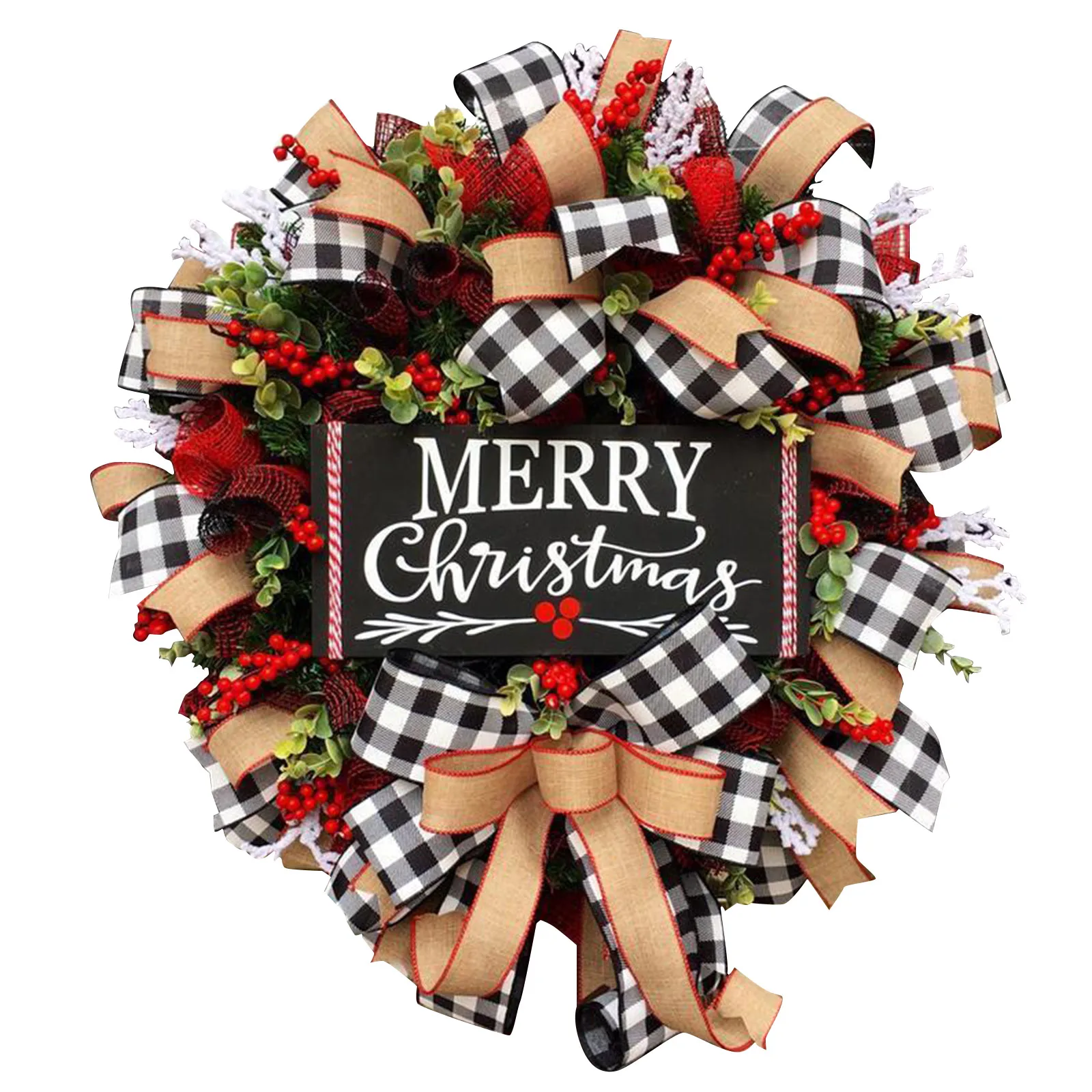 4. Материалы: клетчатая лента из буйвола, лента из мешковины, ягоды, зелень и высококачественные поздравительные открытки. Высококачественный венок был рожден из нашего ремесленного зала.