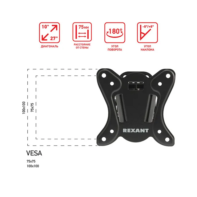 Наклонно-поворотный кронштейн REXANT серии HOME позволит легко и быстро установить на стену телевизор с диагональю 10"-27", весом до 15 килограммов. Приспособление значительно экономит пространство: конструкция выступает всего на 56 мм от стены. Благодаря специальному креплению, положение уже установленного монитора легко менять одним движением руки, подбирая наиболее удачное для приятного и комфортного просмотра. Угол наклона регулируется в диапазоне от -5° до +15°, угол поворота - 60°. Кронштейн выполнен из холоднокатаной стали, которая отличается надёжностью, долговечностью и выдерживает высокие нагрузки. Поддерживает крепления стандарта VESA: 75х75 /100х100 – вместе с необходимым крепежом поставляются в комплекте. Гарантия 20 лет.