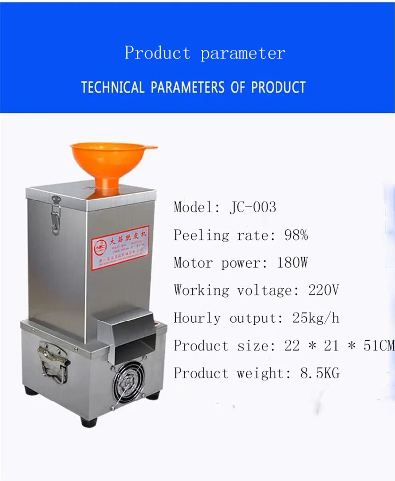 Модель: JC-003 Скорость отслаивания: 98% Мощность двигателя: 180 Вт Рабочее напряжение: 220 В Почасовая мощность: 25 кг/ч Размер изделия: 22*21*51 см Вес продукта: 8,5 кг