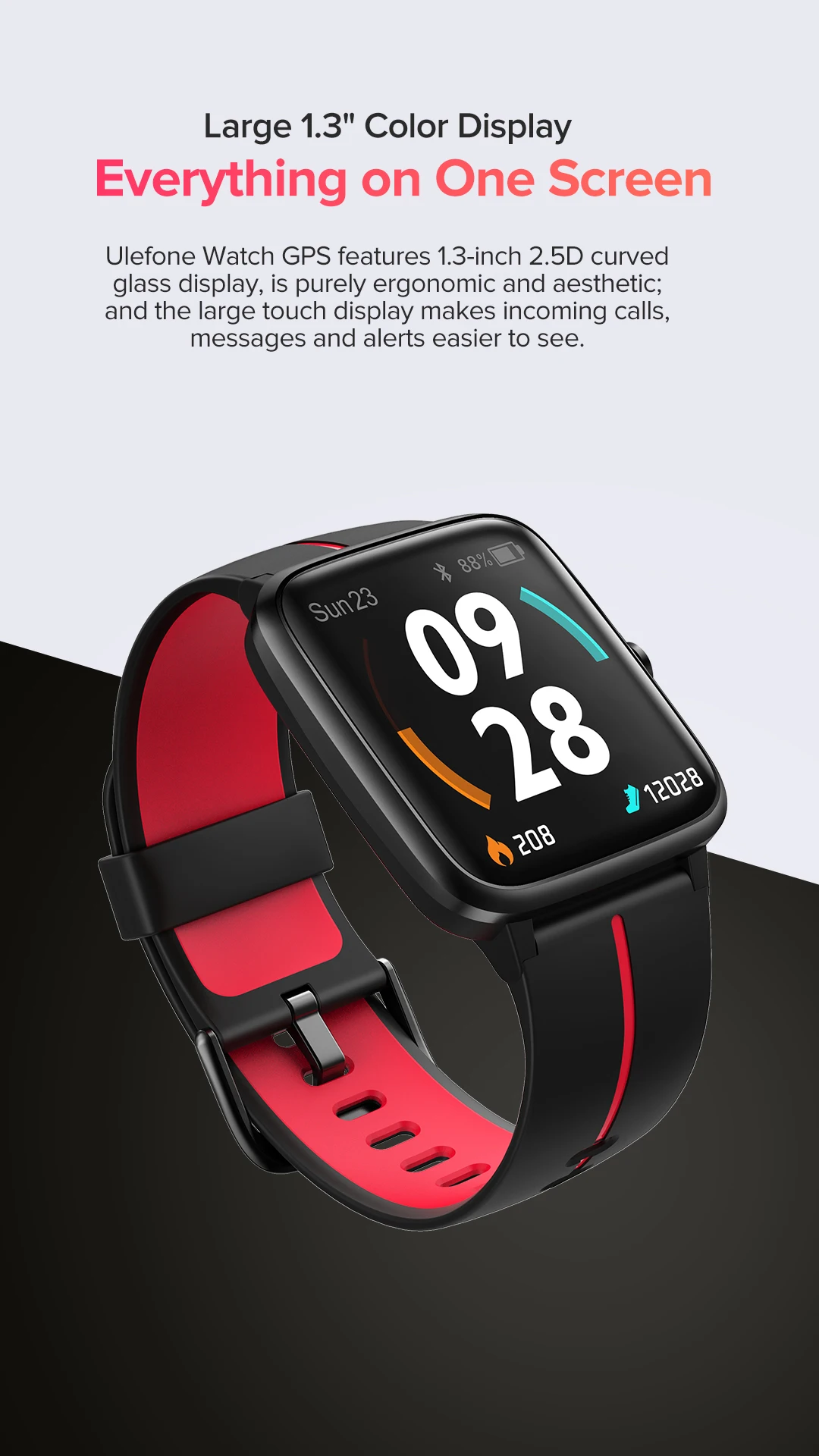 Все на одном экране Чехол-накладка Ulefone часы особенности 1,3-дюймовый 2.5D с изогнутым стеклом, это приемлемо для эргономичный и эстетичный и большой сенсорный дисплей позволяет уведомления о входящих звонках, сообщения и оповещения проще, чтобы увидеть.