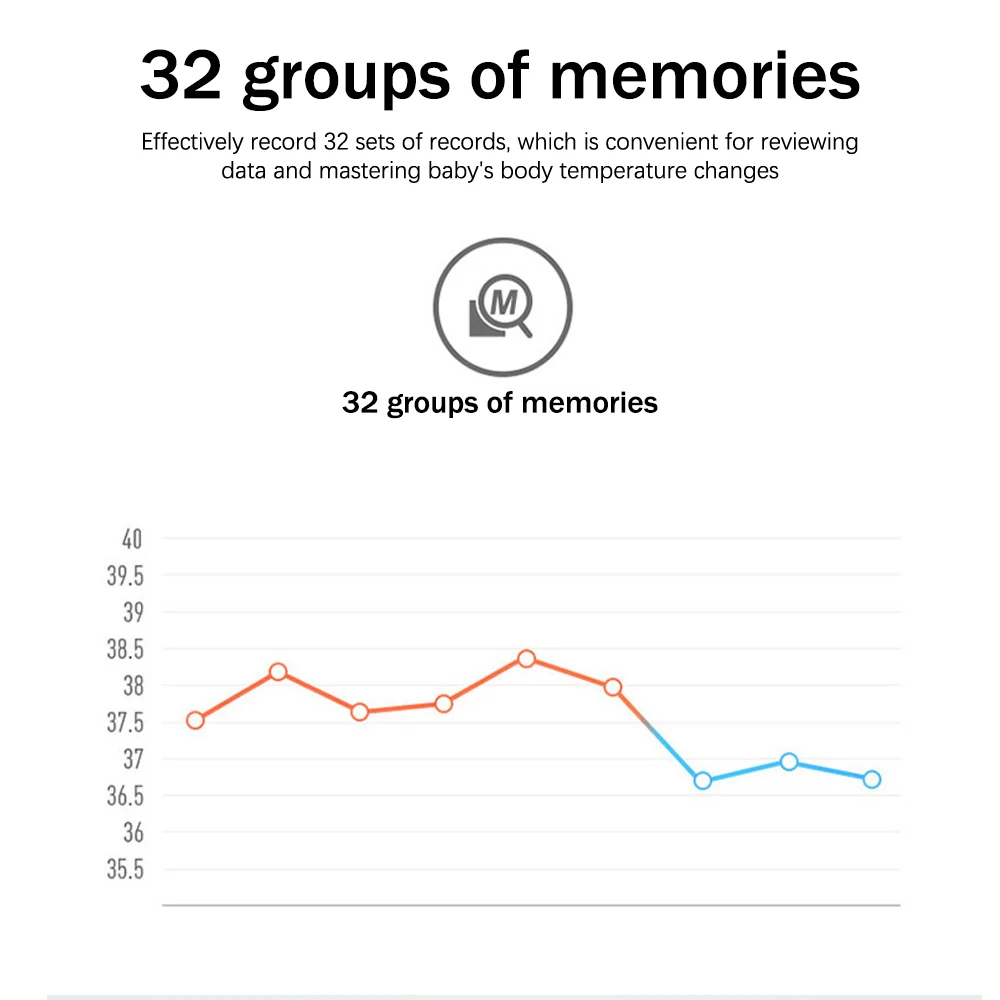 Эффективно записывает 32 набора записей, что удобно для просмотра данных и овладевает изменением температуры тела ребенка
