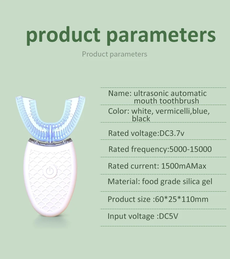 [U-SHAPED design designed for perfect fit the human mouth, vibration at a speed of 48000rpm, cleanable teeth no stone unturned.