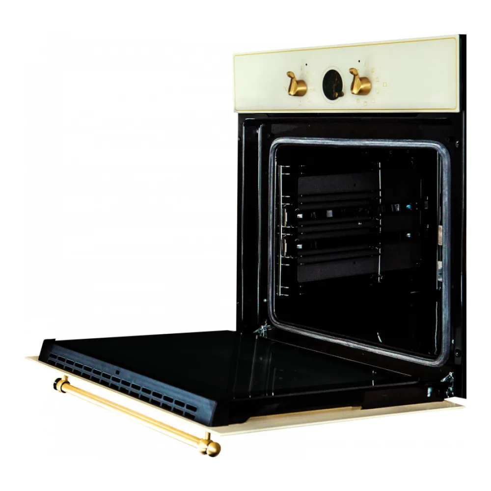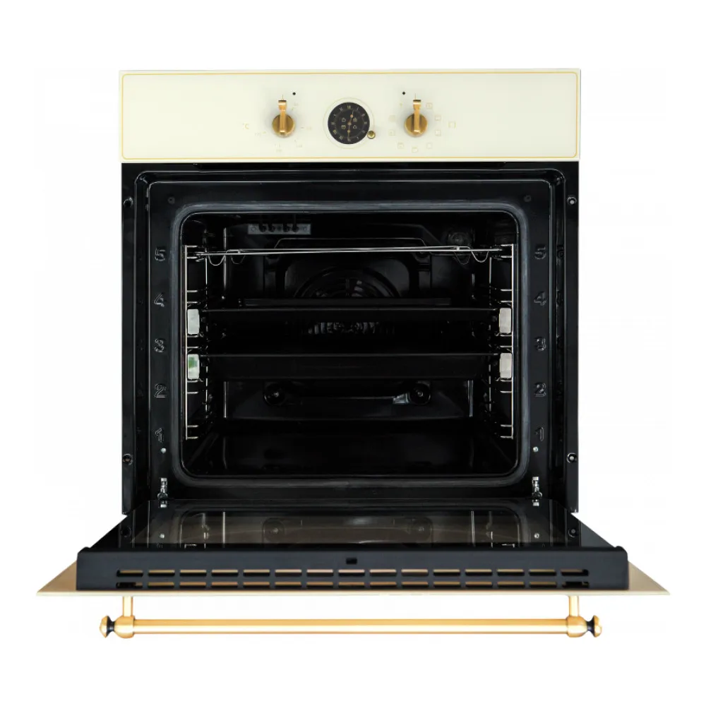 Вертел нет Высота 59.5 см Гарантия 24 мес Глубина 57.5 см Гриль да Дисплей нет Дополнительная духовка нет Защита от детей нет Класс энергопотребления A Количество стекол дверцы духовки 3 Конвекция да Мощность подключения 2.9 кВт Объём духовки 66 л Открытие дверцы откидная Очистка духовки каталитическая Переключатели поворотные Приготовление с паром нет Размер ниши для встраивания (ВхШхГ) 59х56х56 см Стиль Retro Страна производства Турция Таймер да Телескопические направляющие да Термощуп нет Тип гриля электрический Тип таймера звуковой с отключением Функция Пароварка нет Функция СВЧ нет Цвет бронзовыйВНЕШНИЙ ВИД ТОВАРА