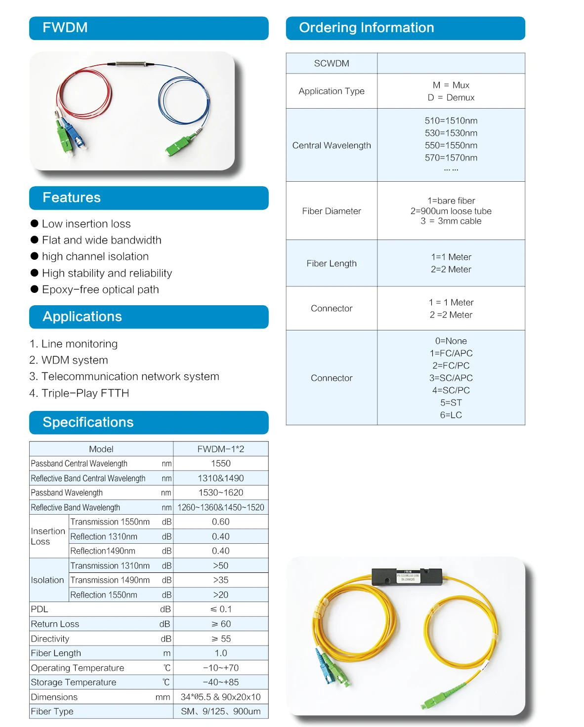 1*2 стальная труба FWDM фильтр 1310/1550/1490nm, 0,9 мм 1 м волоконно-оптический разделитель волн мультиплексор с SC/LC/FC/ST APC коннектором
