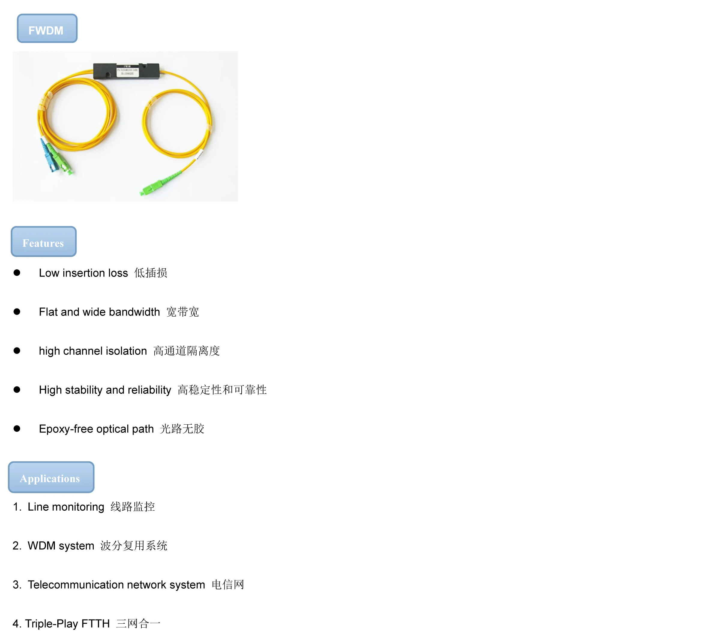 3-Порты и разъёмы фильтр кабельного ТВ-WDM устройство демонстрирует низкие потери и надежные характеристики. Устройство обладает широким диапазоном пропускания и высокой изоляцией, что делает его идеальным вариантом для системы мониторинга и WDM систем. Легко настраиваемый, YHH' FWDM может быть настроен со стандартной упаковкой и вариантами соединителя