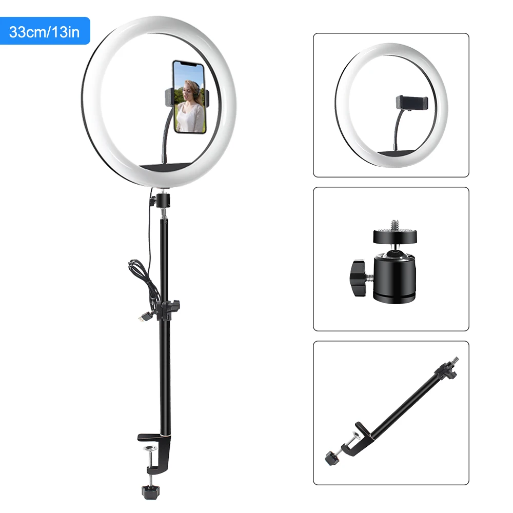 13/12/10 дюймов кольцевой светильник Кольцевой светильник разных диаметров может быть применен в различных случаях, таких как шоу для гурманов, игры в прямом эфире, потоковое видео на youtube, обучение онлайн-курсам, маникюр ногтей, день рождения и т. д. Два хомута для стола : Поставляется с двумя различными хомутами для стола, изготовленными из высококачественного алюминия, его можно отрегулировать на любую длину, чтобы удовлетворить ваши потребности. Один вертикальный Настольный зажим может быть выдвижная от 12 "до 19,5" (30,5 см-49,5 см), вес-хватит, чтобы соответствовать где указан ваш рост. Другая ножничная стойка также может быть настроена на соответствующую высоту для ваших нужд. 10 комбинаций кольцевых ламп и хомутов для стола Больше вариантов для вас, чтобы подобрать лучшую комбинацию для вашего видео. Универсальный держатель для телефона и пульт дистанционного управления камерой : Универсальные чехлы для мобильного телефона держатель может служить удлинением от 2,6 дюймов-3,5 дюймов, совместим с большинством смарт-телефоны, Bluetooth пульт дистанционного спуска затвора (одну кнопку включения пульта дистанционного управления совместим со смартфонами на базе iOS и Android) это избавит ваши руки от съемки на расстоянии 32 футов/10 м. Для фотосъемки и своевременной съемки вашего счастливого момента. Питание от USB : USB Power ed, без батареи. Селфи-светильник работает с большинством устройств, поддерживающих usb-порт, таких как ноутбук, ПК, внешний аккумулятор, зарядное устройство USB, адаптер переменного тока и т. Д. Характеристики: Наименование товара: кольцевой светильник с металлической подставкой Светильник Размер: 33 см/13 дюймов; 30 см/12 дюймов; 26 см/10 дюймов Светильник Цвет: как на картинке Кольцевой светильник: ABS Диапазон затемнения: 1%-100% Цветовая температура: 3200K-5500K Светильник источник света: высокое качество светодиодный SMD Держатель для мобильного телефона для: 5,5-8,5 см Зарядка: usb-разъем Тип: кольцевой светильник с подставкой/кольцевой лампой для макияжа Регулируемая подставка для штатива: как на картинке Светильник Материал стойки: Алюминий Посылка включает в себя: 10 дюймов 26 см с зажимом для телефона + Настольный зажим/ножничная подставка + дистанционный спуск затвора bluetooth (5 стилей) 12 дюймов 30 см с зажимом для телефона + Настольный зажим + пульт дистанционного спуска затвора bluetooth 13 дюймов 33 см с зажимом для телефона + Настольный зажим + пульт дистанционного спуска затвора bluetooth Пожалуйста, обратитесь к набору в соответствии с картинкой.