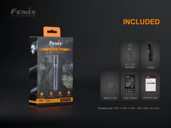 The Fenix TK11 TAC (Tactical Edition) LED flashlight, remains in pocket-size form but surpasses in performance and tactical deployment. Designed with the military and law enforcement professionals in mind, The TK11 TAC features Tactical mode and Duty mode. The Fenix's unique APF (Advanced Pulse-frequency Transmission System) makes more compact structure and stronger anti-interference ability. The TK11 TAC is measured at 5.5'' long and is an up to 1600 lumens flashlight in high output while throwing its beam a distance up to 335 meters. In Duty Mode, the TK11 TAC delivers 4 output modes including a variable strobe. Switch to the Tactical Mode to operate for fast, simplified selection of high and strobe. Perfect for professional use, security and law enforcement, you can count on the TK11 TAC to deliver reliable, powerful lighting for a wide range of situations.