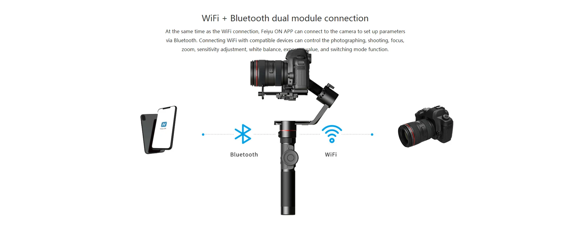Соединение с двойным модулем Wi-Fi + Bluetooth В то же время, что и подключение Wi-Fi, Feiyu в приложении может подключаться к камере для настройки параметров через Bluetooth. Подключение WiFi с совместимыми устройствами может управлять фотографированием, съемкой, фокусом, зумом, регулировкой чувствительности, балансом белого, значением экспозиции и функцией переключения режима.