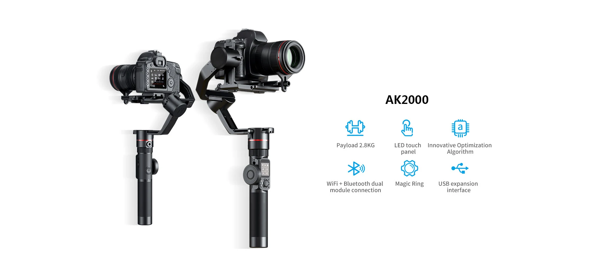 Управление сенсорным управлением более чем флагманский Несущая способность AK2000 приходит от ультра-больших моторов вращающего момента бесконечной мощности и нового высокопроизводительного чипа в комбинации с интеллектуальным алгоритмом анти-встряхивания. Анти-вибрация также может использоваться в экстремальных условиях и может нести вес профессиональных зеркальных камер и объективов всех брендов.
