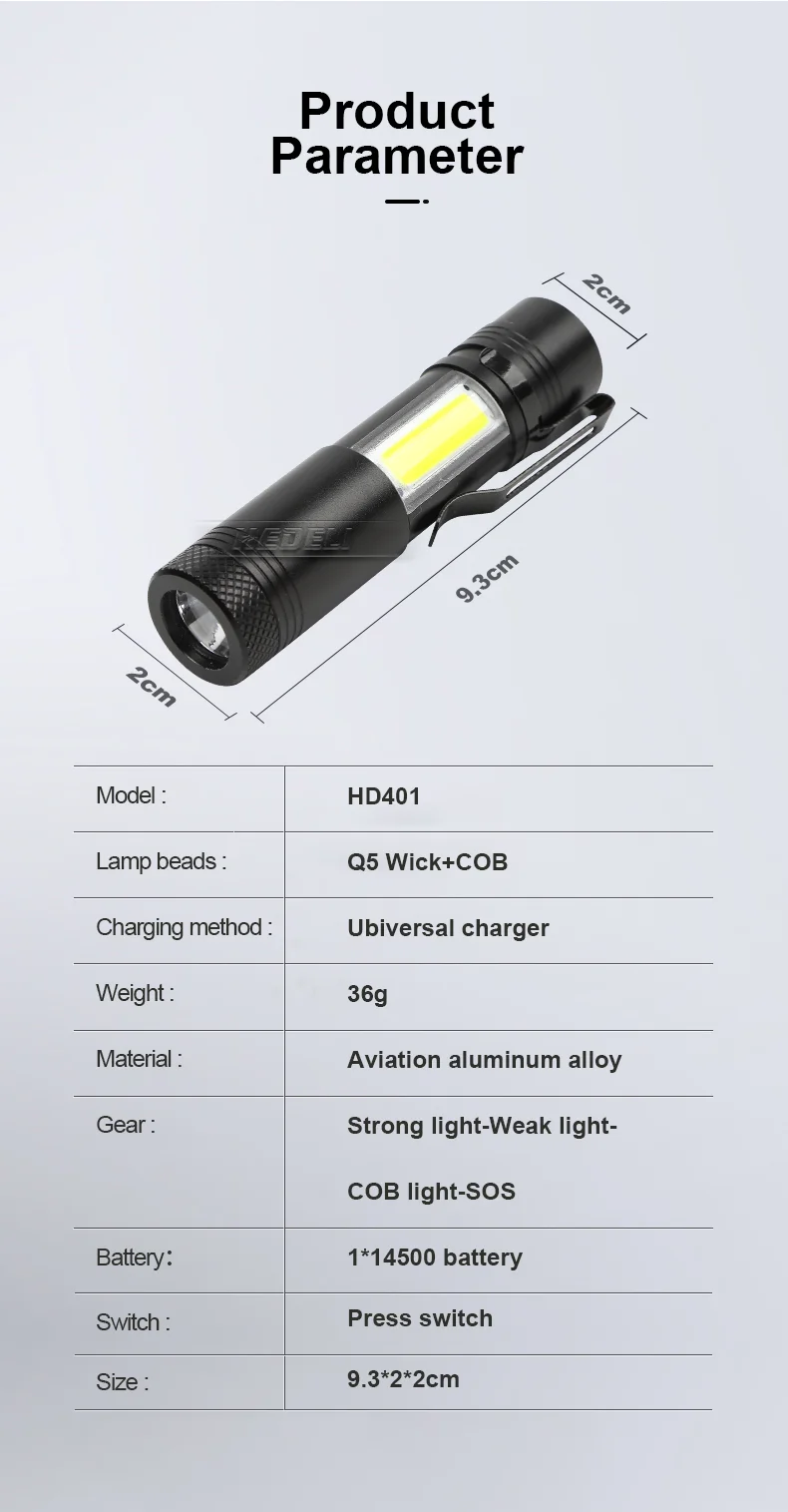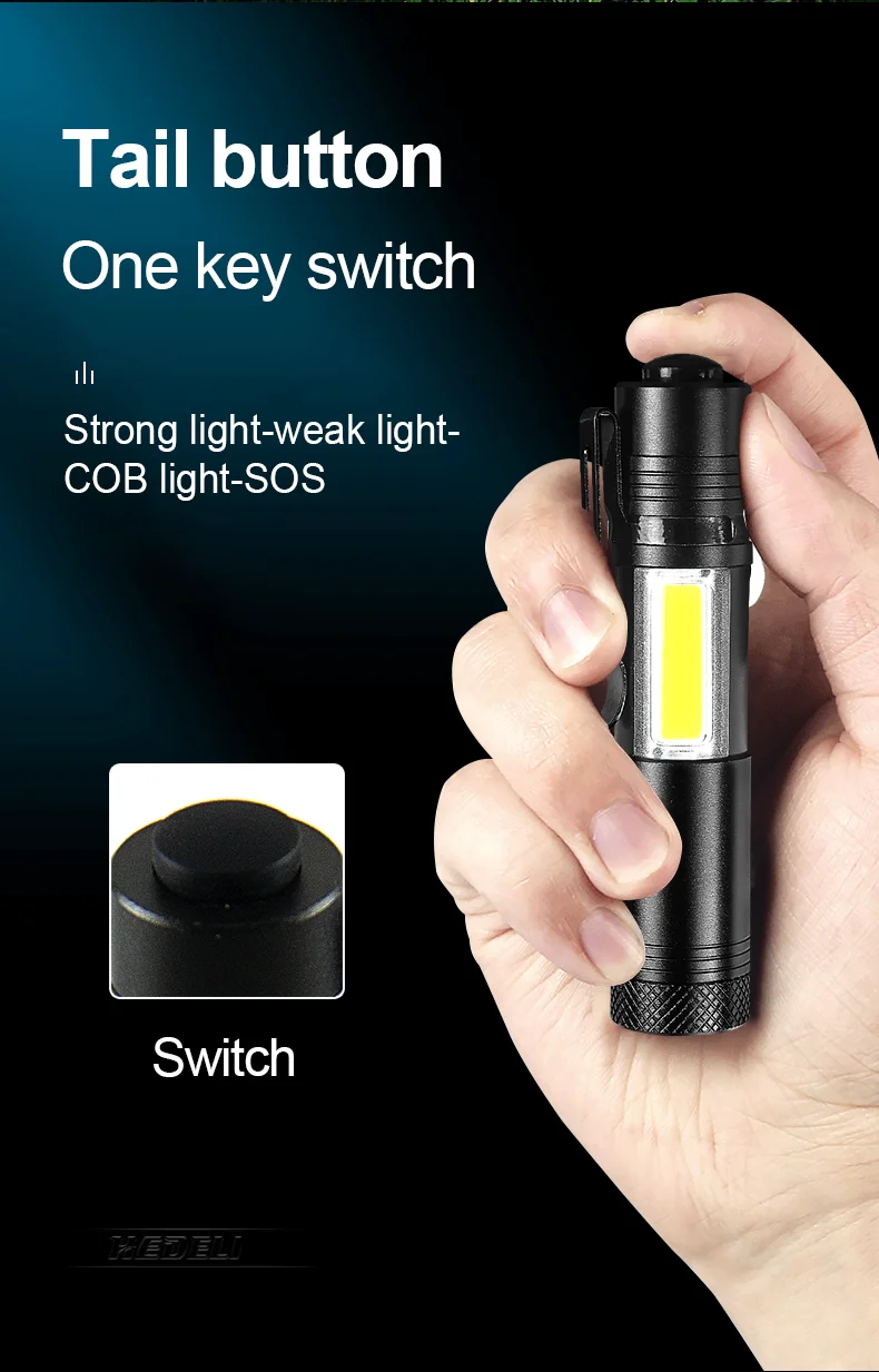 product features: Flashlight is suitable for camping and night reading • 4 modes: Q5 strong light/Q5 low light/COB strong light/COB burst flash • waterproof level: IPX-6 • Body color: Black • Lighting time: 14450 battery or AAA battery 3-5 hours • Flashlight Type: Camping,hunting,Working,Fishing,Outdoor,search and rescue
