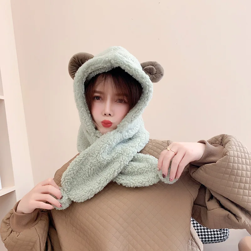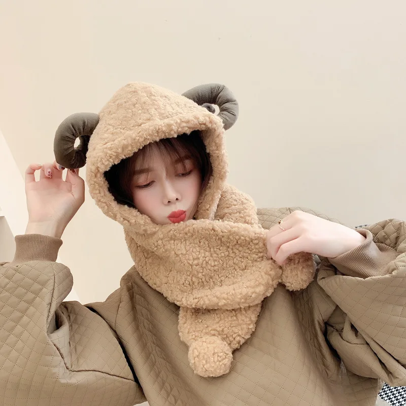 Женская зимняя теплая плюшевая цельная шапка, шарф с овечьими ушками, теплая шапка с капюшоном, милая шапка из козьего рога, Женская флисовая шапка 3 в 1, шарфы Материал: искусственный мех