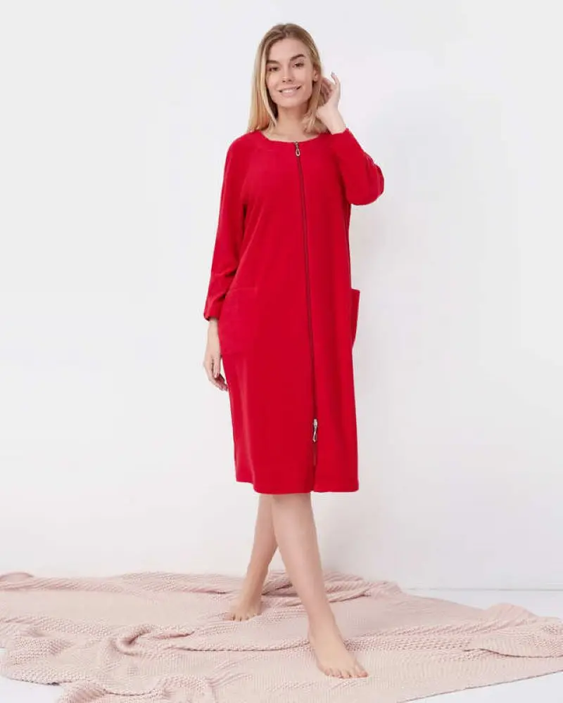Удобный махровый халат из ткани с хлопком в составе. Длина ниже колена, двусторонняя молния и укороченный рукав - лаконичный дизайн для комфортного домашнего образа. Из коллекции бренда Eva Cambru.