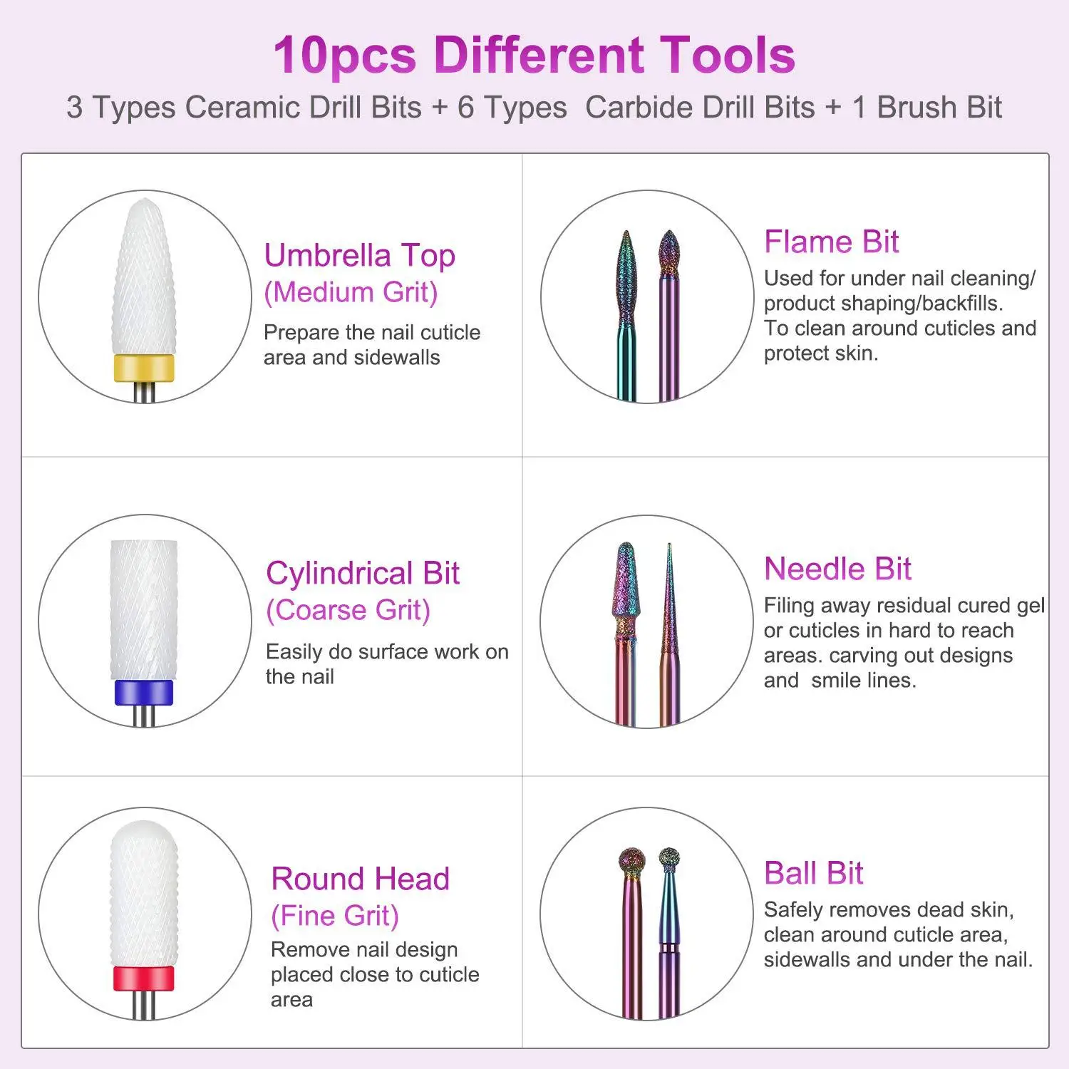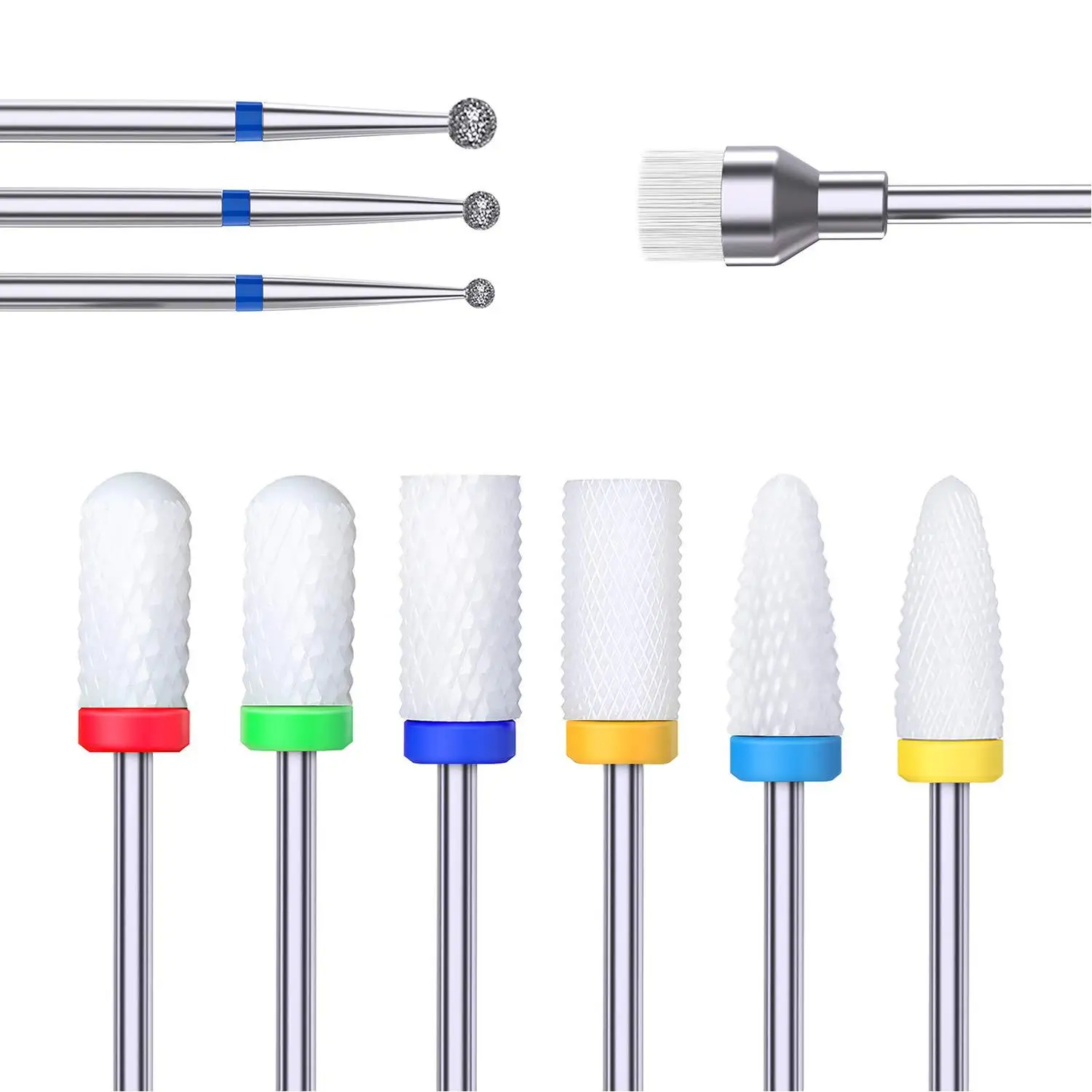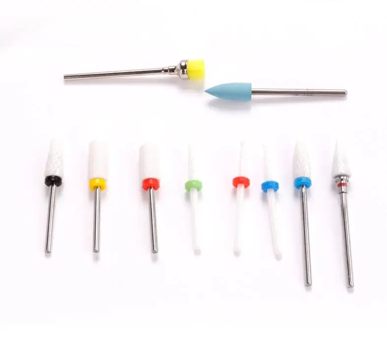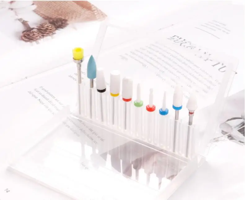 Набор сверл для ногтей Материал: сплав вольфрамовой стали, бриллиант, керамика Количество: 10 шт./компл. Диаметр ручки инструмента: 2,35 мм Упаковка: в коробке