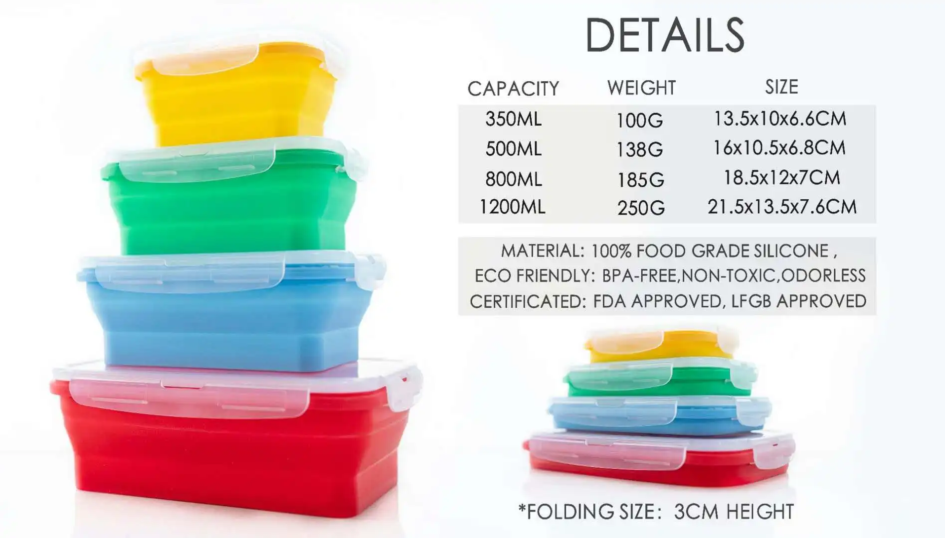 Характеристика: 1. Пищевой материал, здоровый и безопасный. 2. Легко моется, в посудомоечной машине. 3. Подходит для микроволновой печи и морозильной камеры. 4. Складной и герметичный. Спецификация: Наименование товара: складная силиконовая коробка для завтрака Материал: пищевой силикон + ПП Размер: как показано на картинке Емкость: 350/500/800/1200 мл Вес: 100/138/185/250 г Посылка: 1 шт. или набор Примечание: В комплект входят 4 шт. (1 шт. 350 мл + 1 шт. 500 мл + 1 шт. 800 мл + 1 шт. 1200 мл)