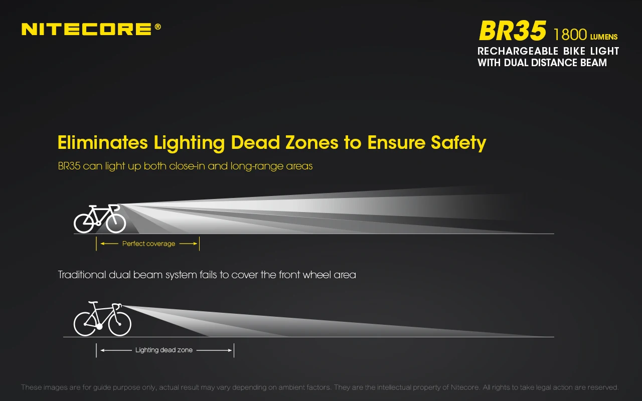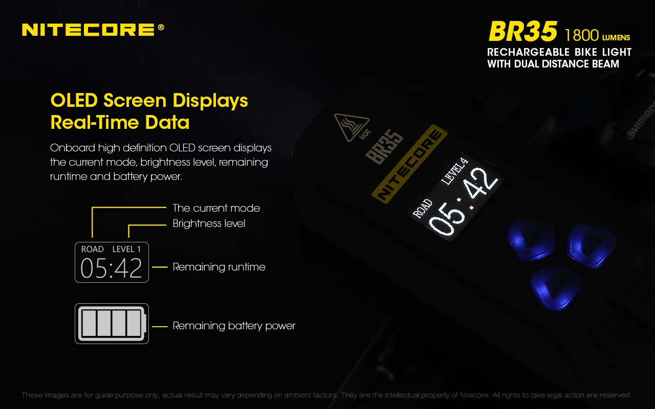 Посылка включает в себя: Nitecore BR35 * 1, пульт дистанционного управления * 1, крепление на руль велосипеда * 1, толстые крепления * 2,USB кабель (2A) * 1