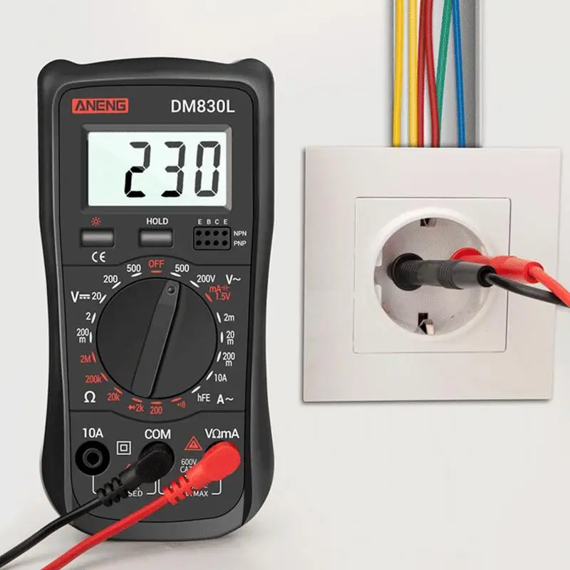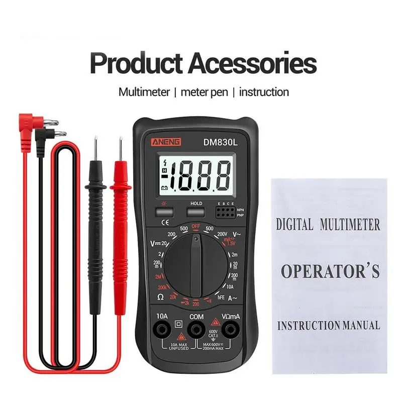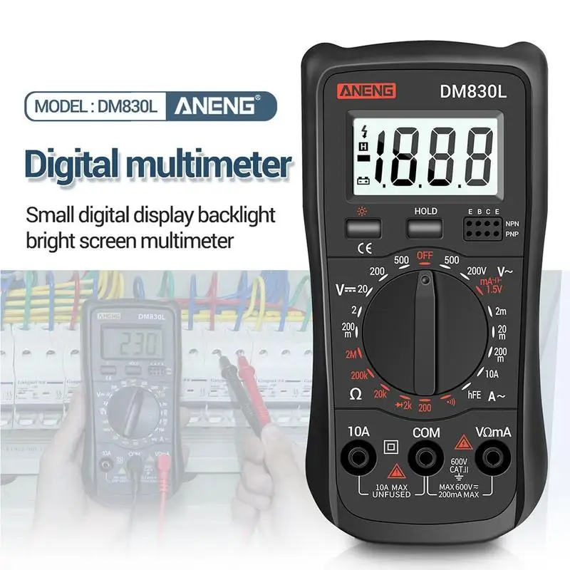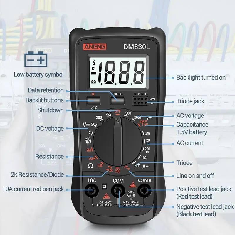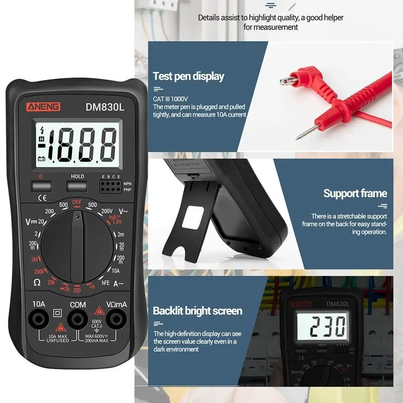 Измеритель-это цифровой мультиметр руля 31/2 для измерения напряжения постоянного и переменного тока, переменного тока, сопротивления, диода, транзистора, свободности, температуры, емкости и проверки целостности цепи с аккумулятором. Задсветильник дисплея не является обязательным.