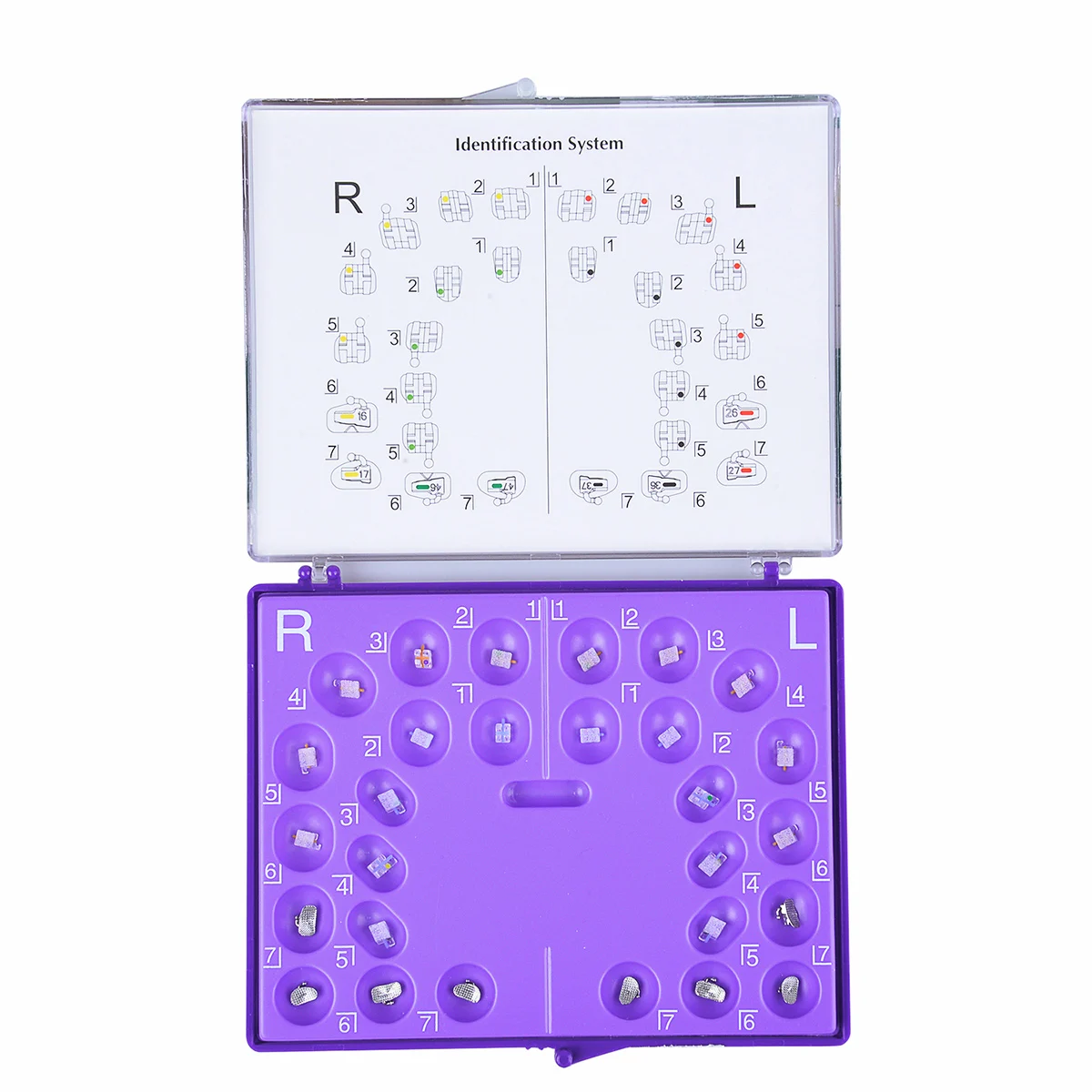 Скобы для позиционирования легко различать между верхними и нижними зубьями; Это способствует скреплению скобок для ориентации и выравнивания, после склеивания скоб, упорядоченных рядов, снимите оранжевый/светло-синий цвет, а затем Наденьте провод arch.