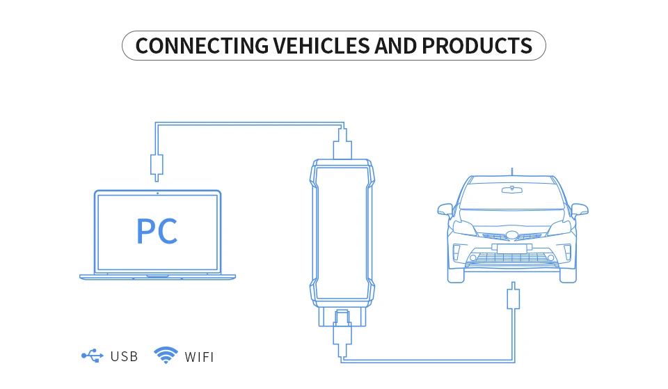 Поддерживает связь по Wi-Fi и USB для передачи данных транспортного средства на ноутбук через диагностическое программное обеспечение.