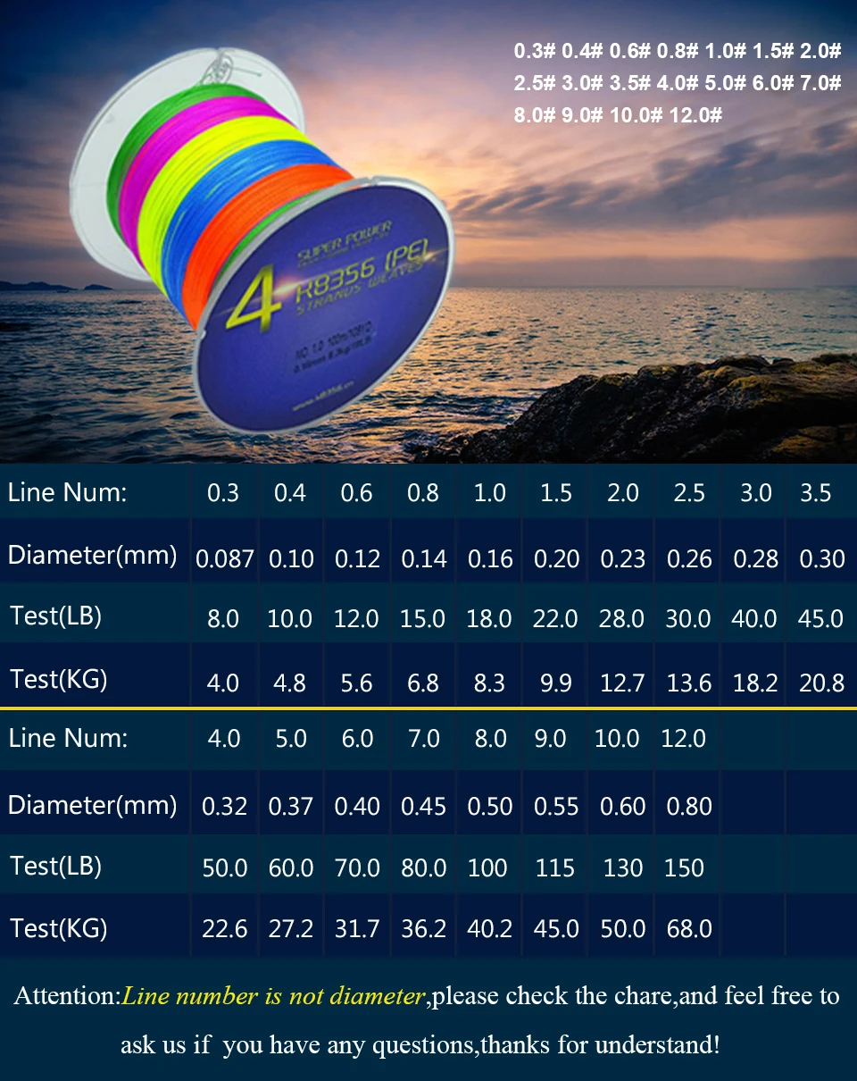 100 м 300 м 500 м 4PE плетеные лески многофиламентная леска прочная плетеная проволока аксессуары для ловли карпа гладкие 12-130LBОписание характеристики: 1.9 цветов на ваш выбор, два разных цвета-один цвет на десять метров. 2,4 линии PE, высококачественные материалы, уникальная тканая структура, изготовленная из сверхпрочного полиэтиленового волокна. 3. Поверхностное специальное покрытие, более гладкое, чем когда-либо. 4. Исключительная прочность и прочность, более прочный, трудно тянуть. 5. Превосходная обработка и более тонкий диаметр для легкой резки воды. 6. Чрезвычайно низкая память. 7. Качественный материал обеспечивает цветную прямую оплетку. Параметры продукта: Линия Num 0,3 0,4 0,6 0,8 1,0 1,5 2,0 2,5 3,0 Диаметр (мм) 0,08 0,10 0,12 0,14 0,16 0,20 0,23 0,26 0,28 Тест (LB) 8,0 10,0 12,0 15,0 18,0 22,0 28,0 30,0 40,0 Тест (кг) 4,0 4,8 5,6 6,8 8,3 9,9 12,7 13,6 18,2 Линия Num 3,5 4,0 5,0 6,0 7,0 8,0 9,0 10,0 12,0 Диаметр (мм) 0,30 0,32 0,37 0,40 0,45 0,50 0,55 0,60 0,80 Тест (LB) 45,0 50,0 60,0 70,0 80,0 100 115 130 150 Тест (кг) 20,8 22,6 27,2 31,7 36,2 40,2 45,0 50,0 68,0 Внимание: Номер линии не является диаметром , Пожалуйста, проверьте стоимость и не стесняйтесь задать нам, если у вас есть какие-либо вопросы, спасибо за понимание!