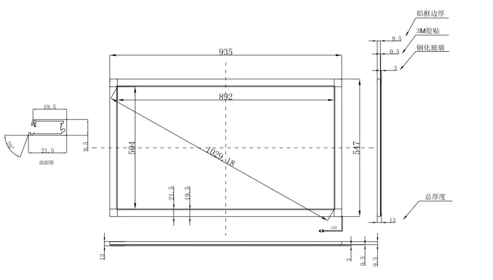 40 inch 10 points IR multi touch screen Product Dimension Drawing: