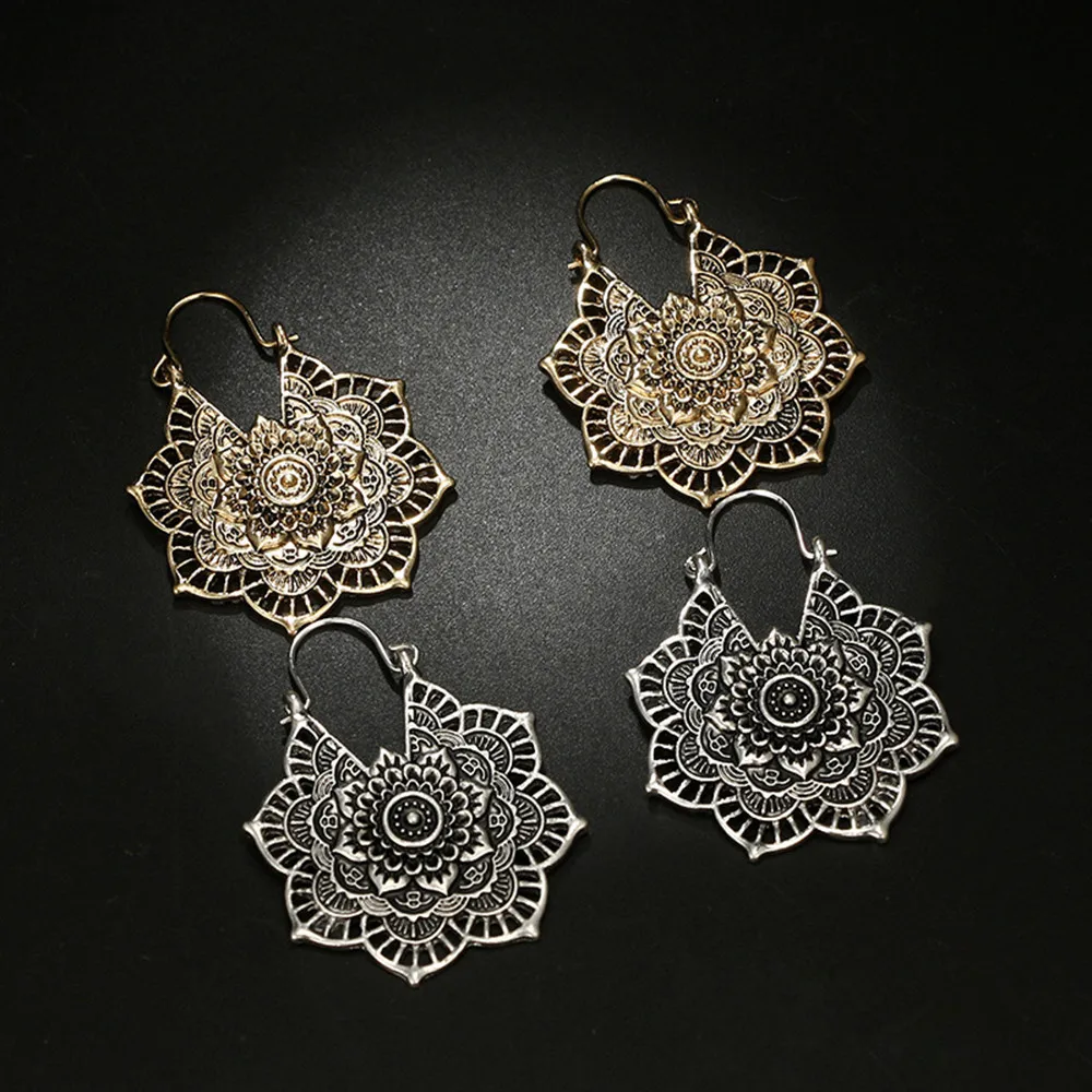 Antique silver Gypsy Indian Tribal Ethnic Hoop Dangle Mandala Earrings Boho