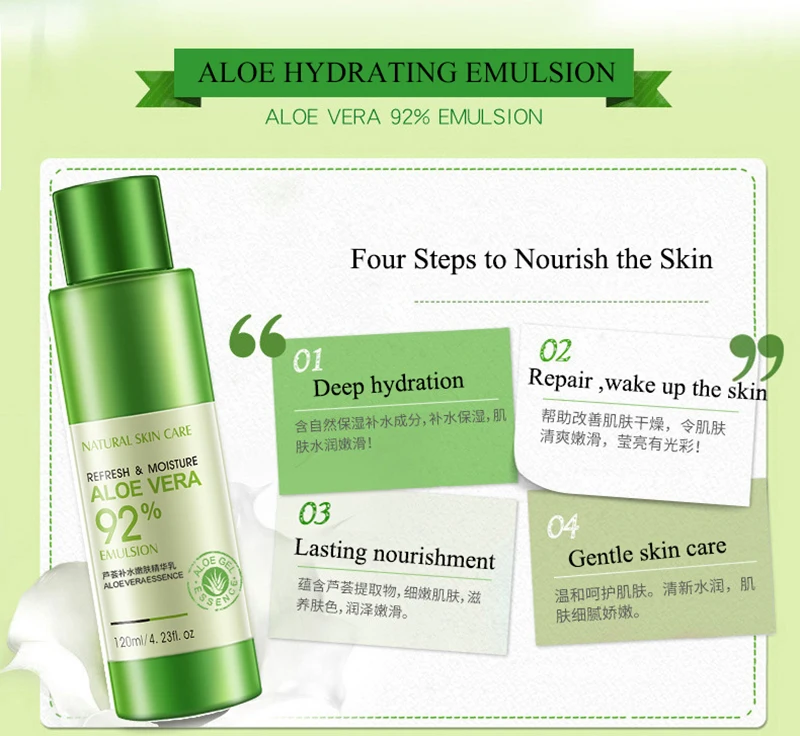 [Название продукта] алоэ Увлажняющая эмульсия [Характеристики продукта] 120 мл [Эффективность продукта] Легкий лосьон с алоэ легко впитывает, восполняет влагу, необходимую коже, мягкий и гладкий, помогает улучшить сухую кожу и глубоко питает кожу. [Срок использования] 3 года [Подходит для кожи] всех типов кожи