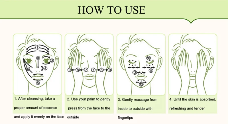 1. После очищения Возьмите необходимое количество эссенции и равномерно нанесите ее на лицо 2. Аккуратно прижмите ладонь к внешней стороне 3. Мягко массируйте изнутри и снаружи кончиками пальцев 4. До тех пор, пока кожа не впитывается, освежает и нежит