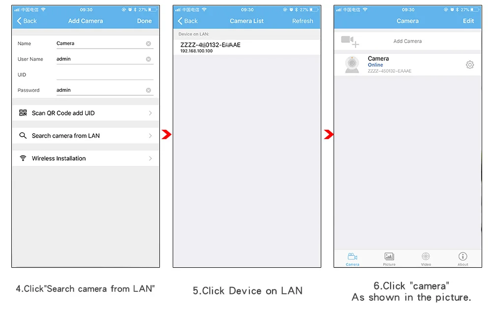 Формат SSID-это шесть Кол-во IPCAM - UID, пароль-01234567.