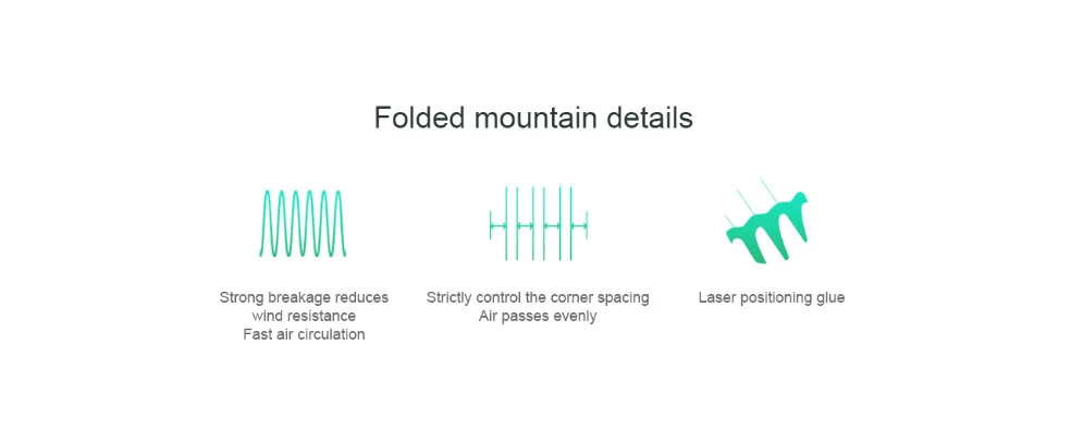 Высокоэффективный фильтрующий материал может фильтровать крошечные частицы размером с нанометры. Фильтр построен с деталями сложенной горы, а сильное складывание снижает сопротивление ветру и позволяет воздуху быстро циркулировать.