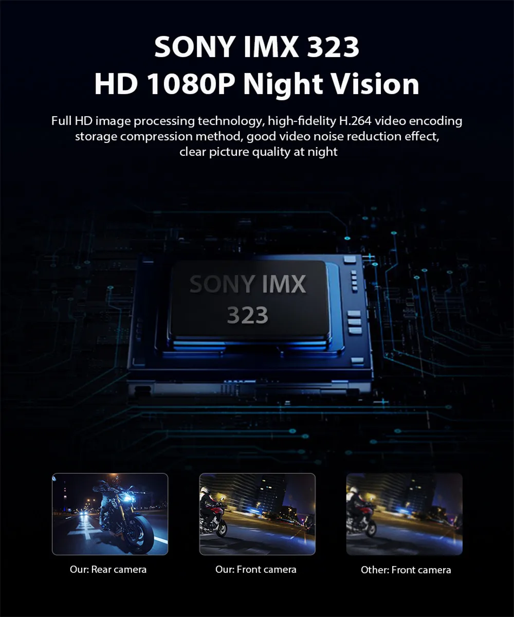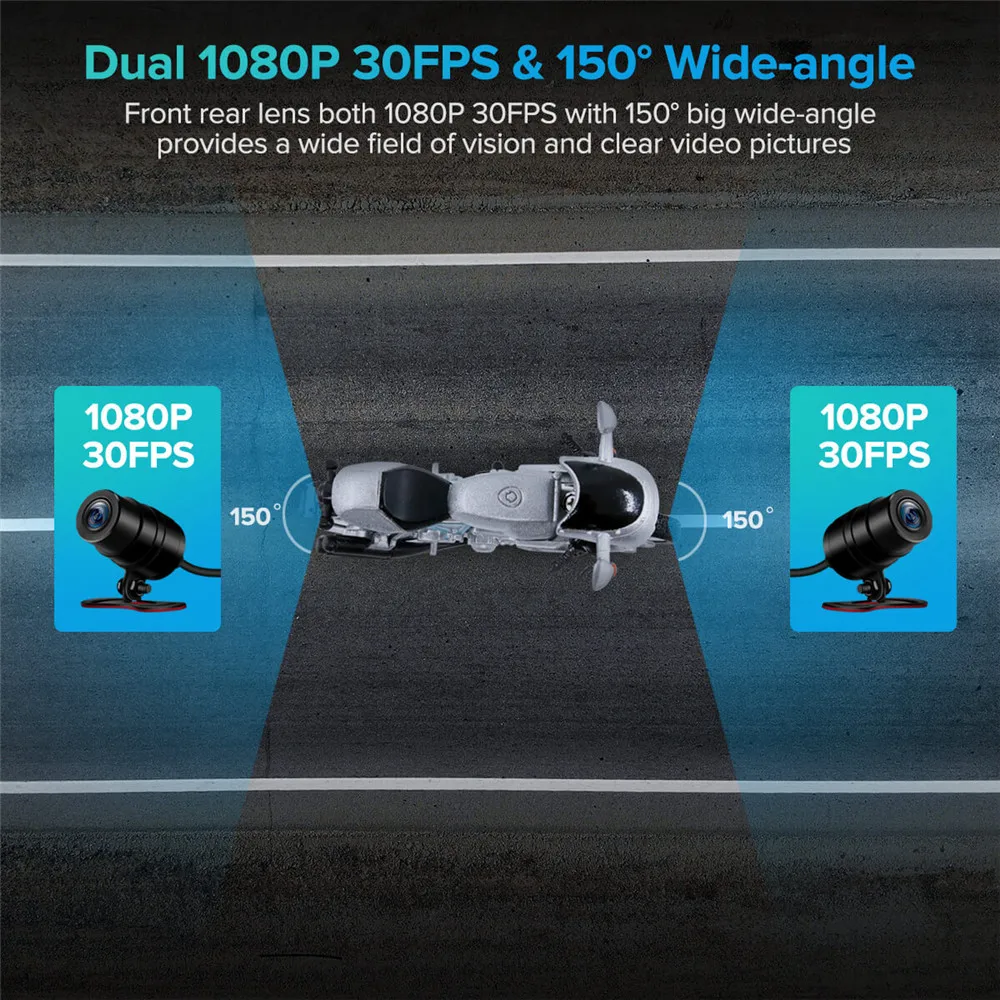 Передними и задними камерами FHD 1080P: подходит для SONY IMX323 CMOS, 6-слой стеклянного объектива и F1.8 фиксированным фокусным расстоянием большой апертурой, которые могут полностью повысить глазурь производительность с низким уровнем светильник условий, при звезда светильник ночное видение съемки. Вне зависимости от дня и ночи, вы можете снимать прекрасные и четкие видео. Оба этих двух объектива имеют широкий угол 150 градусов, который может покрыть несколько полос съемки, и в общей сложности 300 градусов съемки принесет вам всестороннюю защиту.