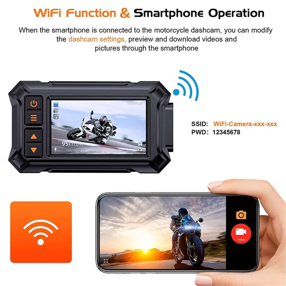 Wi-Fi и проводное управление: Используйте приложение RoadCam для беспроводного подключения ваш мобильный телефон к камере мотоцикла для просмотра мгновенной информации, например, через ваш мобильный телефон. Легко загружать, редактировать и делиться видео на местных социальных платформах. Через проводное управление, он может быть установлен рядом с рулем, что позволяет быстро нажать кнопку дистанционного управления, чтобы заблокировать файлы, делать фотографии или записывать голоса в чрезвычайной ситуации или крупном случае.