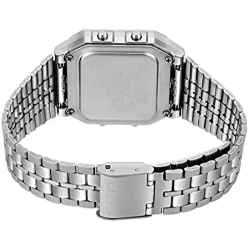 Квадратные часы серебристого цвета со светодиодный Ной подсветкой, пятью ежедневными будильниками и сигналами часов, секундомером 1/100 секунды. Чехол из смолы 34 мм со стеклянным циферблатом и кварцевым механизмом с цифровым дисплеем. Имеет формат 12/24 часов, полный автоматический календарь и мировое время. Браслет из нержавеющей стали со складной застежкой Водонепроницаемость.