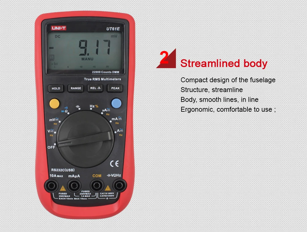 1. UT61A/B/C/D/E являются истинными измерениями RMS 2. Все модели имеют аналоговый бар 3. Рабочий цикл до 0.1%-99.9% 4. Автоматический диапазон и автоматическое отключение питания 4. С RS-232 подключения к компьютеру для записи данных (за исключением UT61A) 5. Хранение данных и максимальное/смешанное измерение 6. Входное сопротивление для DCV 7. ЖК-дисплей обратно-светильник дисплей (за исключением UT61E) 8. 22000 Счетный дисплей для UT61E,6000 Счетный дисплей для UT61C & D,4000 Счетный дисплей для UT61A & B 9. Измерение слабых сигналов 10. Непрерывный звуковой сигнал 11. Диапазон измерения температуры-40 °C ~ 1000 °C/-40 °F ~ 1832 °F (только UT61B и UT61C)